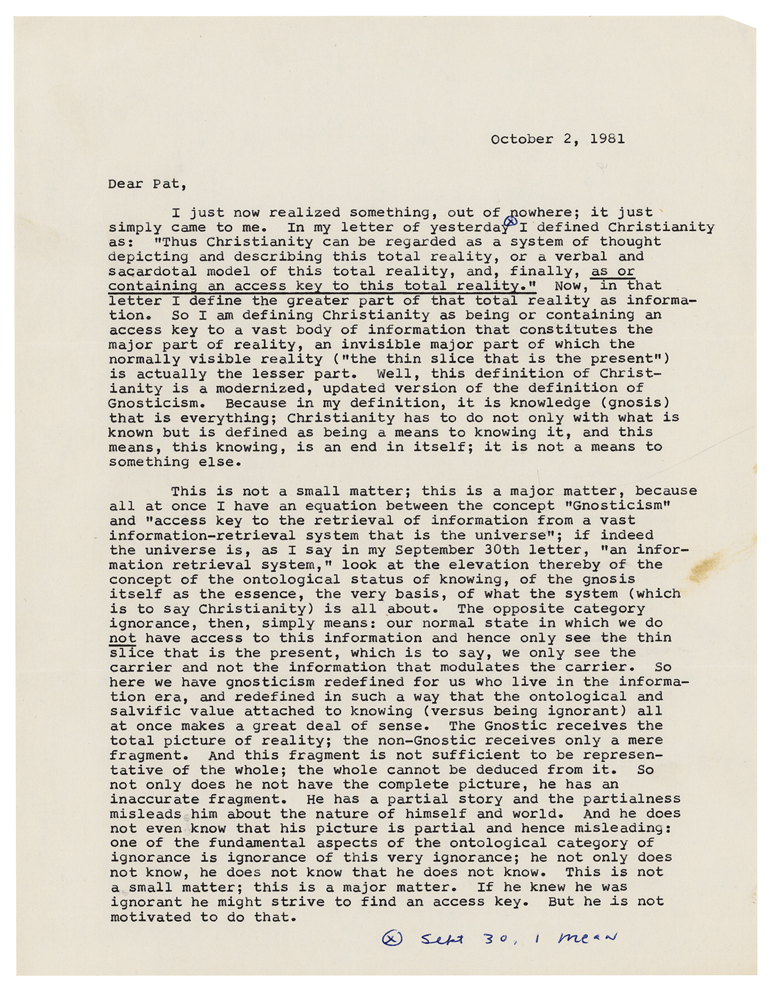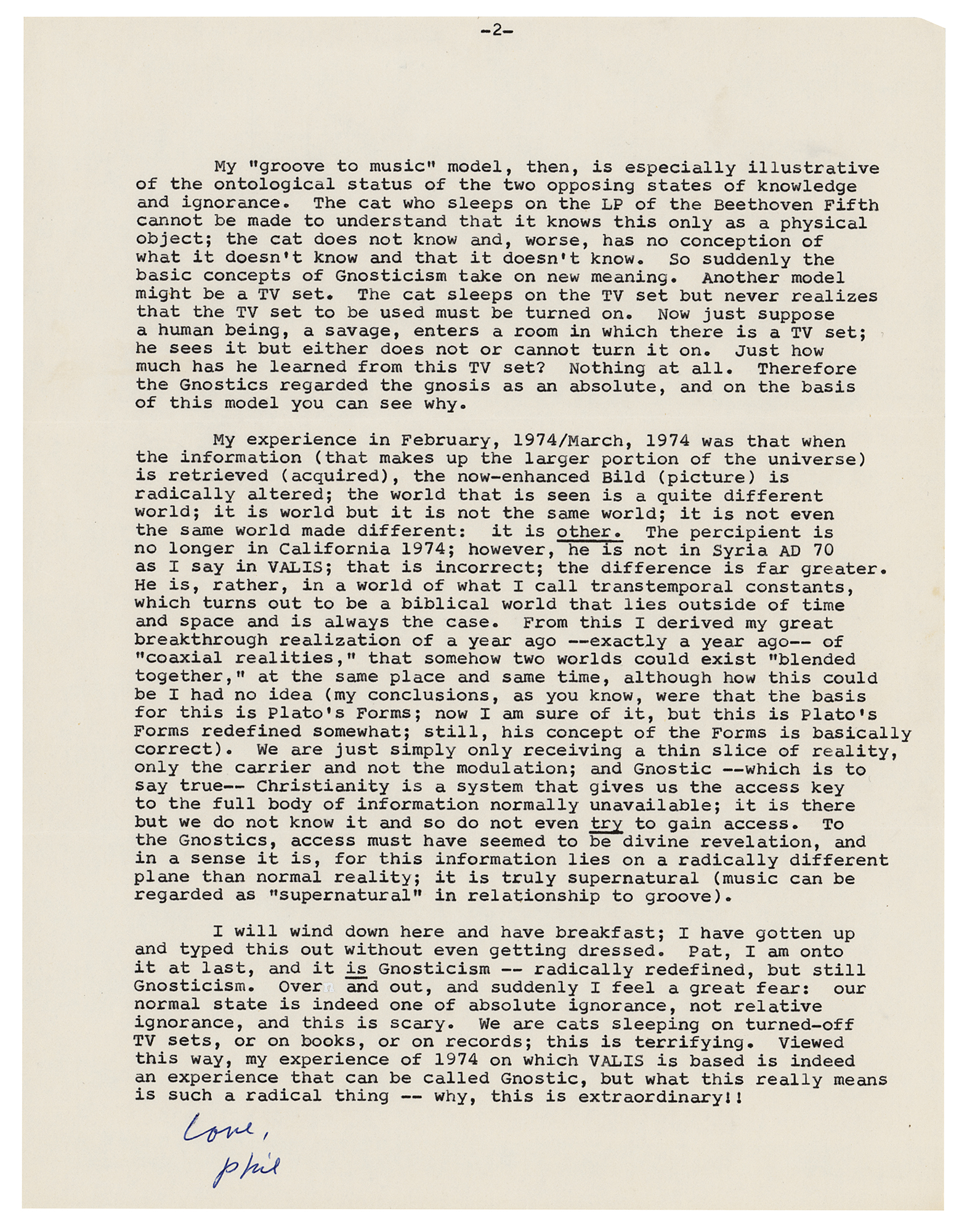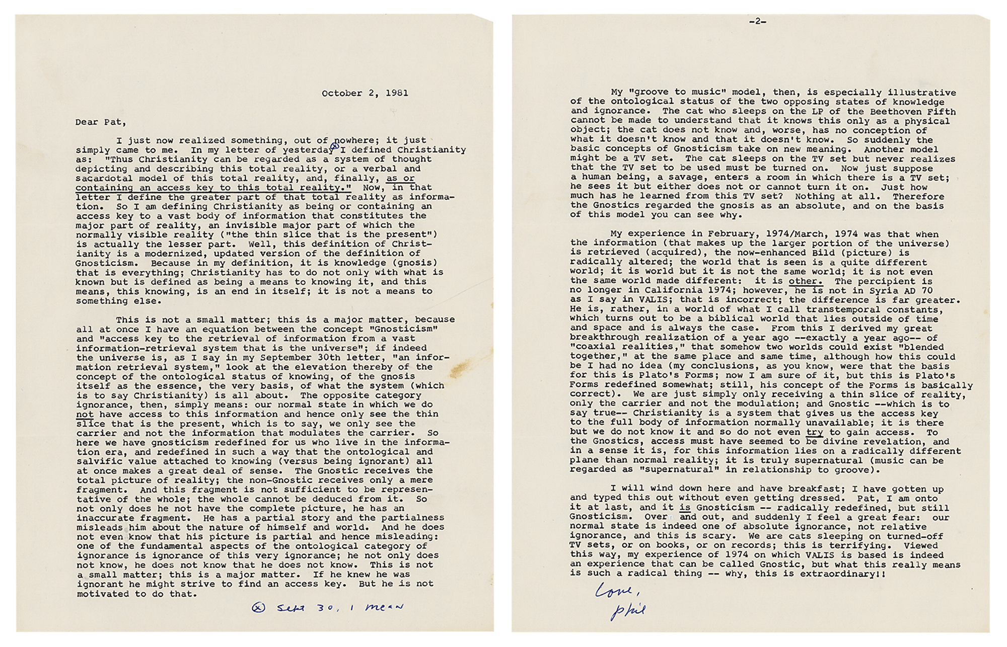TLS signed “Love, Phil,” two pages, 8.5 x 11, October 2, 1981. Letter to science fiction author Patricia Warrick, in part: "I just now realized something, out of nowhere; it just simply came to me. In my letter of yesterday I defined Christianity as: 'Thus Christianity can be regarded as a system of thought depicting and describing this total reality, or a verbal and sacardotal model of this total reality, and, finally, as or containing an access key to this total reality.' Now, in that letter I define the greater part of that total reality as information. So I am defining Christianity as being or containing an access key to a vast body of information that constitutes the major part of reality ('the thin slice that is the present') is actually the lesser part. Well, this definition of Christianity is a modernized, updated version of the definition of Gnosticism. Because in my definition, it is knowledge (gnosis) that is everything; Christianity has to do not only with what is known but is defined as being a means to knowing it, and this means, this knowing, is an end in itself; it is not a means to something else.