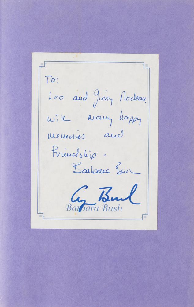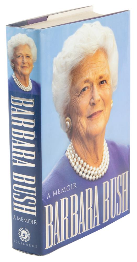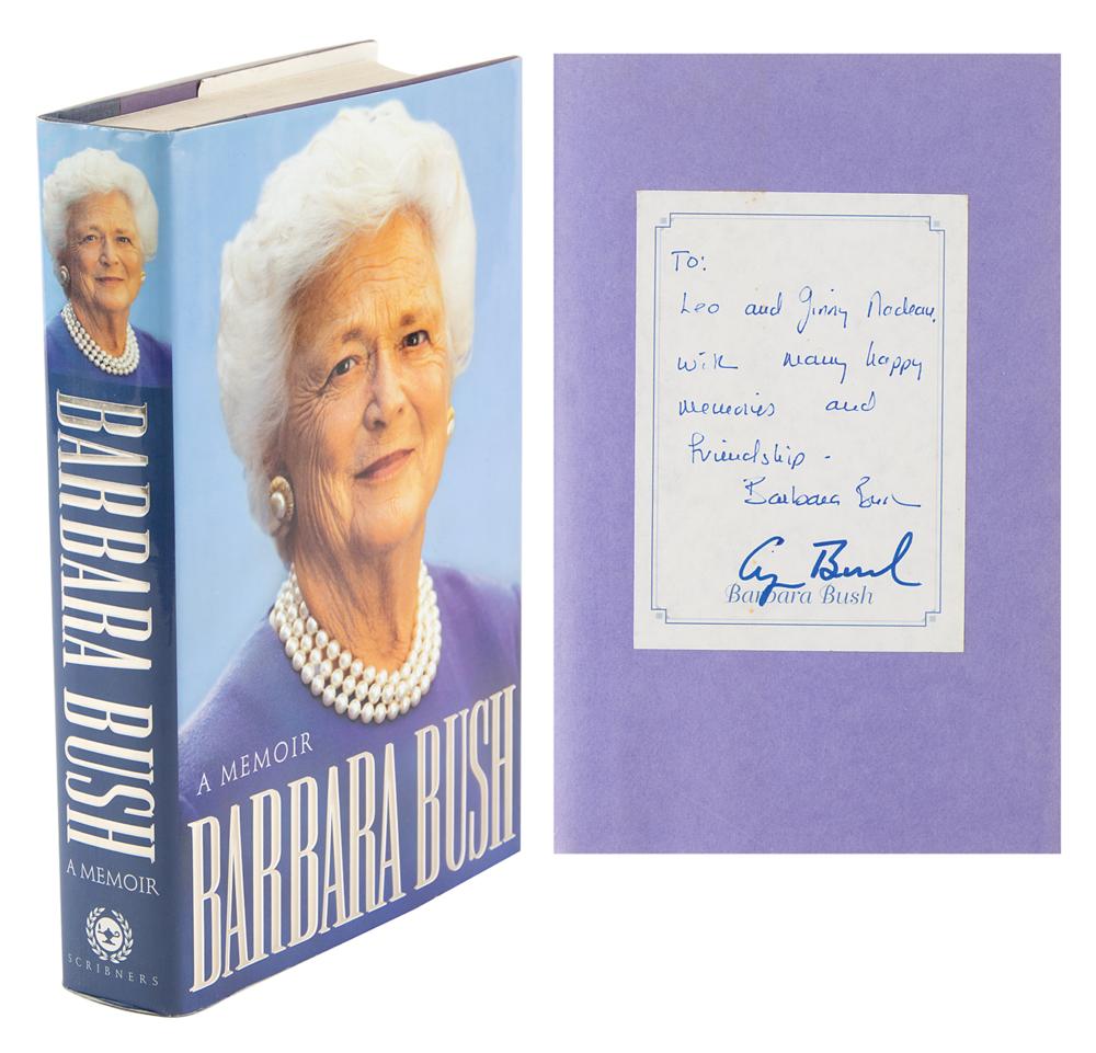 Signed book: Barbara Bush: A Memoir. Signed edition. NY: Charles Scribner's Sons, 1994. Hardcover, 6.75 x 9.5, 575 pages. Signed in blue felt tip by George Bush and in blue ink by Barbara Bush on a bookplate affixed to the first free end page, with Barbara adding the inscription, "To: Leo and Ginny Nadeau, with many happy memories and friendship." In fine condition.
