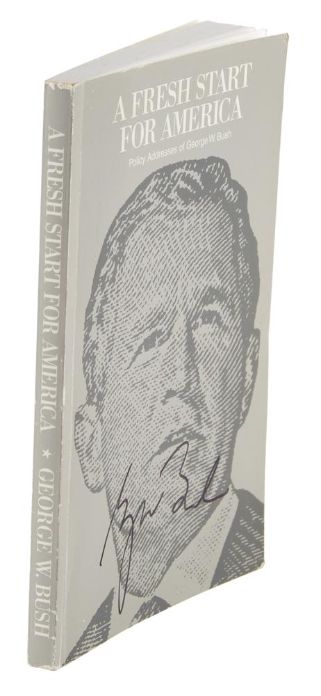 Signed book: A Fresh Start for America: Policy Addresses of George W. Bush. Austin, Texas: Bush for President, Inc., 1999. Softcover, 5.25 x 8.25, 208 pages. Signed on the front cover in black felt tip by George W. Bush. In fine condition, with some slight rubbing to corners and edges.