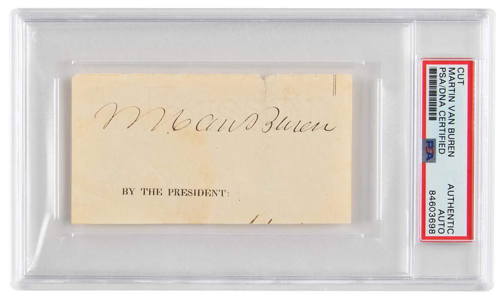 Ink signature as president, "M. Van Buren,” on an off-white 4.25 x 2.25 sheet clipped from a four-language ship's pass. In fine condition. Encapsulated in a PSA/DNA authentication holder.