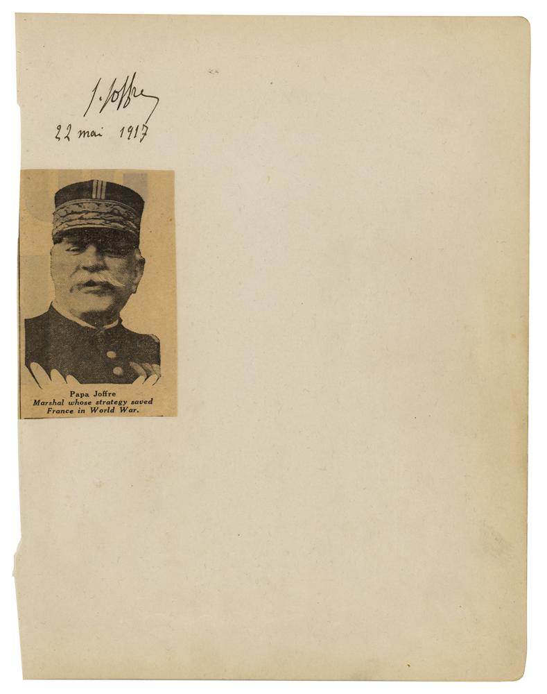 French general (1852-1931) who served as Commander-in-Chief of French forces on the Western Front from the start of World War I until the end of 1916; hailed as the savior of France for his victory at the Marne. Vintage ink signature of Joseph Joffre, “J. Joffre, 22 mai 1917,” on an off-white 7.25 x 9.25 album page bearing an affixed clipping. In fine condition.