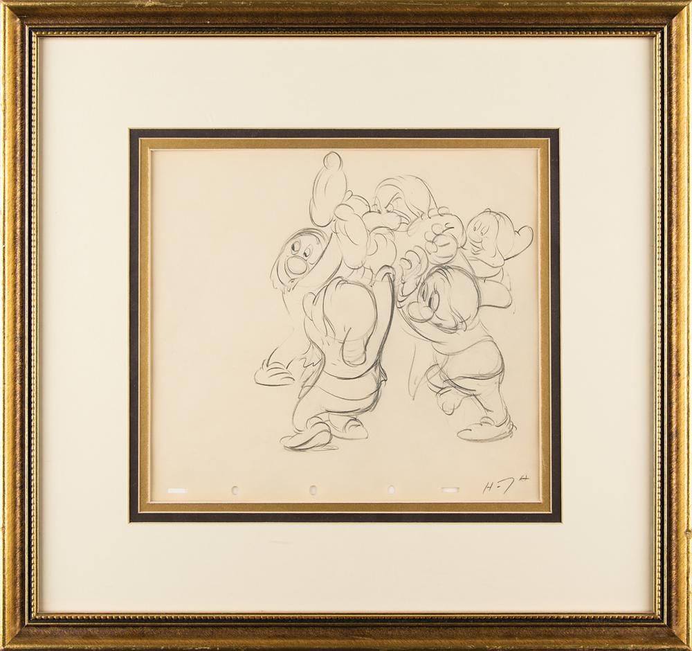 (Walt Disney Studios, 1937) Excellent original production drawing of Sleepy, Happy, Sneezy, Bashful, and Grumpy from Snow White and the Seven Dwarfs, depicting the ornery dwarf being carried to a water basin during the film's memorable washing sequence. Accomplished in graphite on 10 x 9 animation paper marked "H-7" in the lower right corner. Total character image measures 7 x 7.5. Triple-matted and framed to an overall size of 17.5 x 16.5; frame backing bears a certificate of authenticity from the Toon Publishing Group. In fine condition. An appealing five-dwarf drawing with superb action and detail.