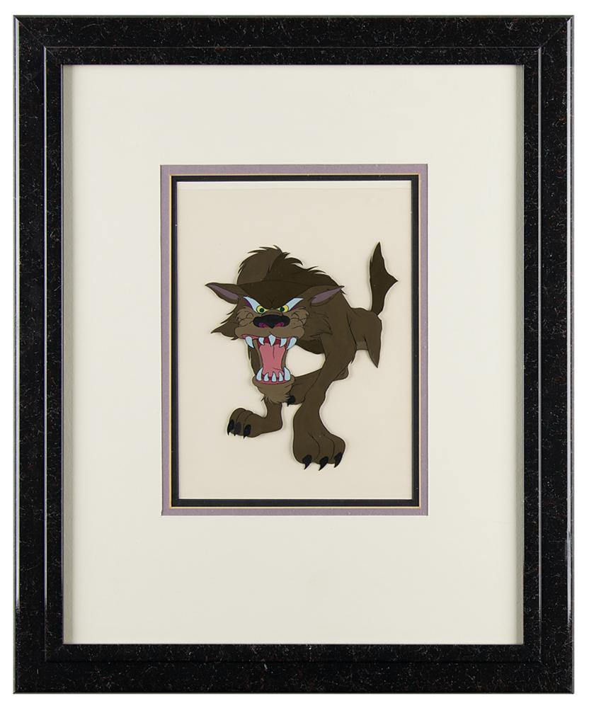 (Walt Disney Studios, 1946) Original production cel of the evil wolf from the 'Peter and the Wolf' segment of the musical anthology film Make Mine Music, depicting the snarling title beast in a ferocious front-facing pose. Character image measures 5.5 x 7, with a mat opening of 7 x 9.5. Triple-matted and framed to an overall size of 16.75 x 20.25. In fine condition. A terrifically scarce and scary production cel of an uncommonly offered Disney villain.