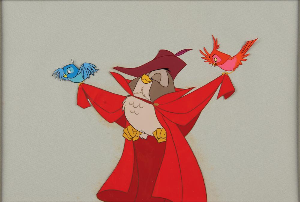 (Walt Disney Studios, 1959) Original production cel featuring The Mock Prince from Sleeping Beauty, showing the enrobed owl flanked by a pair of birds. Image measures 6.2 x 5.25, with a mat opening of 9.25 x 6.25. Matted to an overall size of 12 x 9, with the reverse bearing a gold 1959 Walt Disney Productions label stating: "This is an original handpainted celluloid drawing actually used in a Walt Disney production." In fine condition, with bumped corners to the mat.