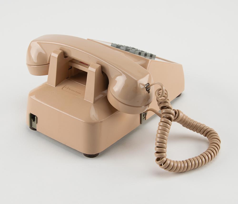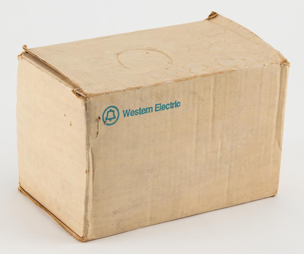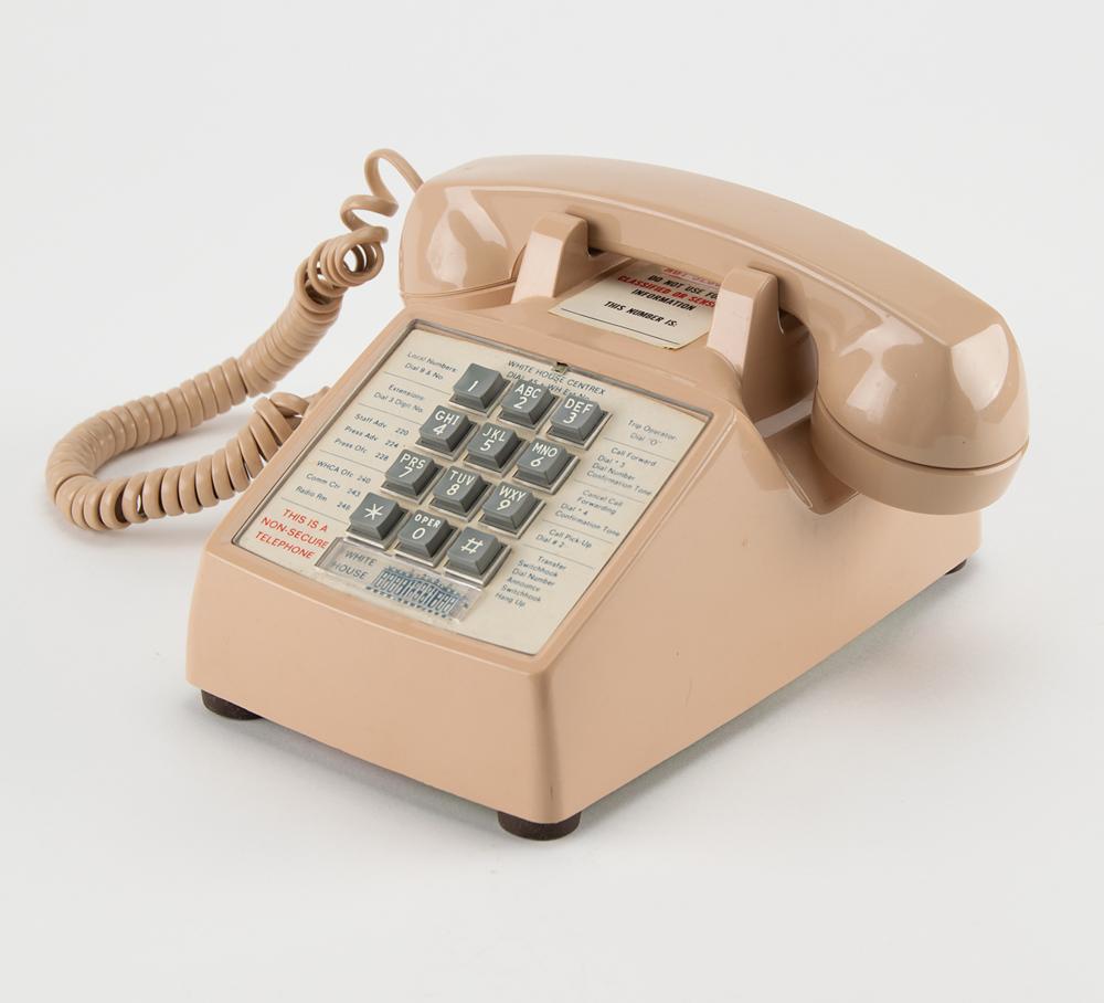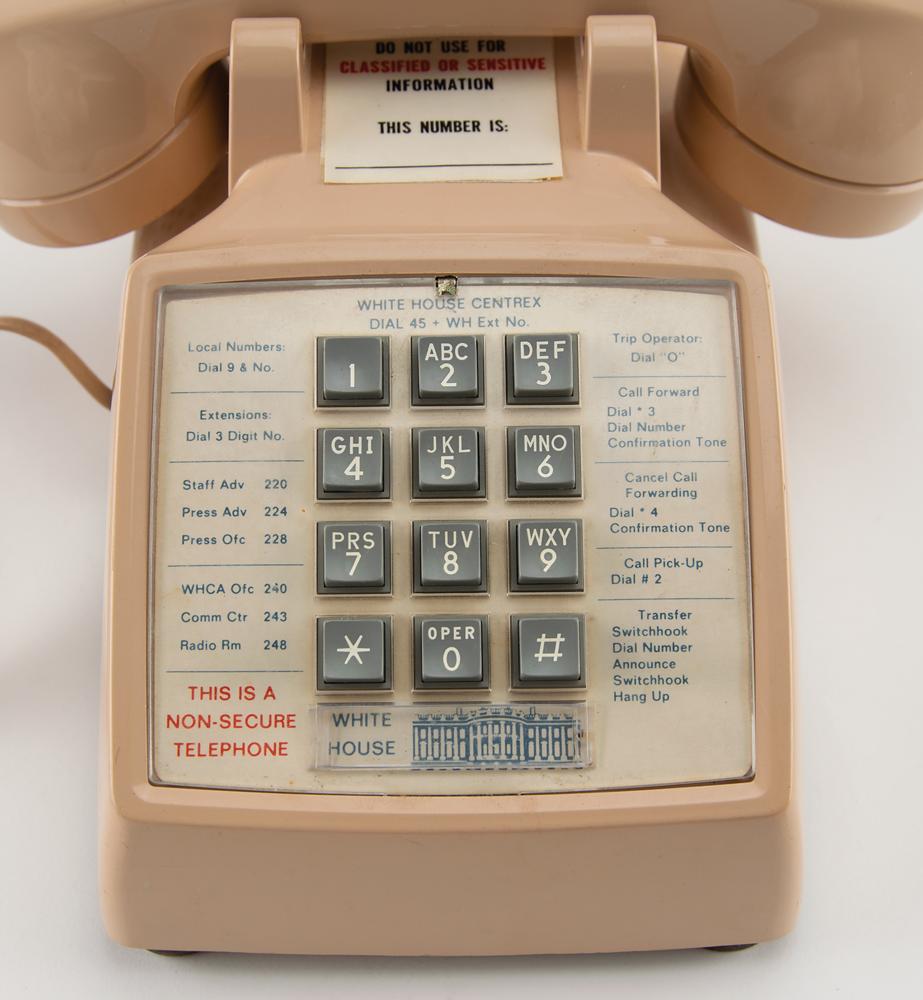 Beige Western Electric telephone from the White House used during the Nixon administration. The phone, model 2500DMG, with removable handset and coiled cord, measures approximately 6 x 9 x 5, and features a key listing White House Centrex extensions in the button area and an affixed label reading: "Not Secure, Do Not Use For Classified or Sensitive Information." This model was manufactured between 1968 and 1984. In fine condition; working condition untested. Accompanied by the original Western Electric cardboard box.
