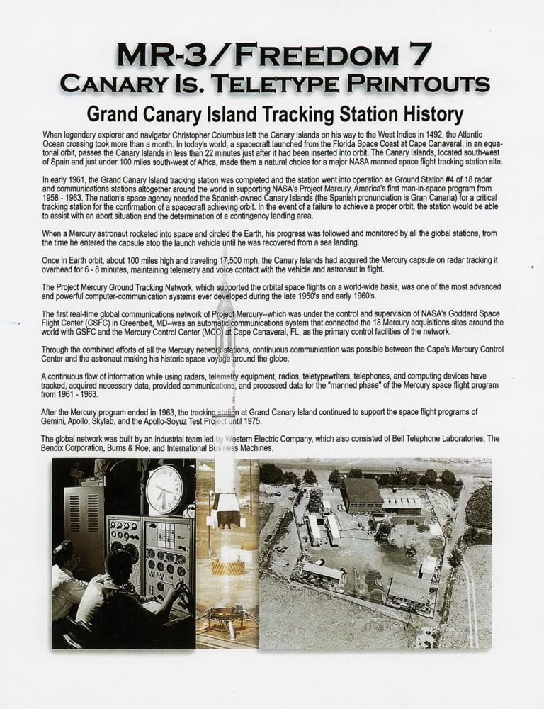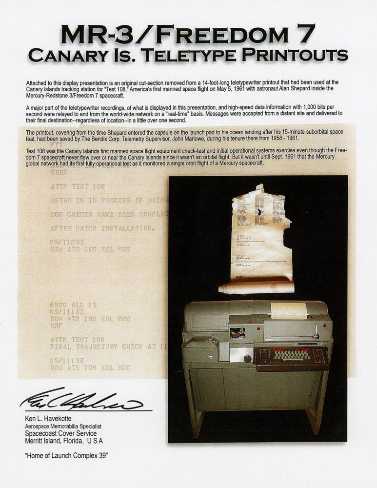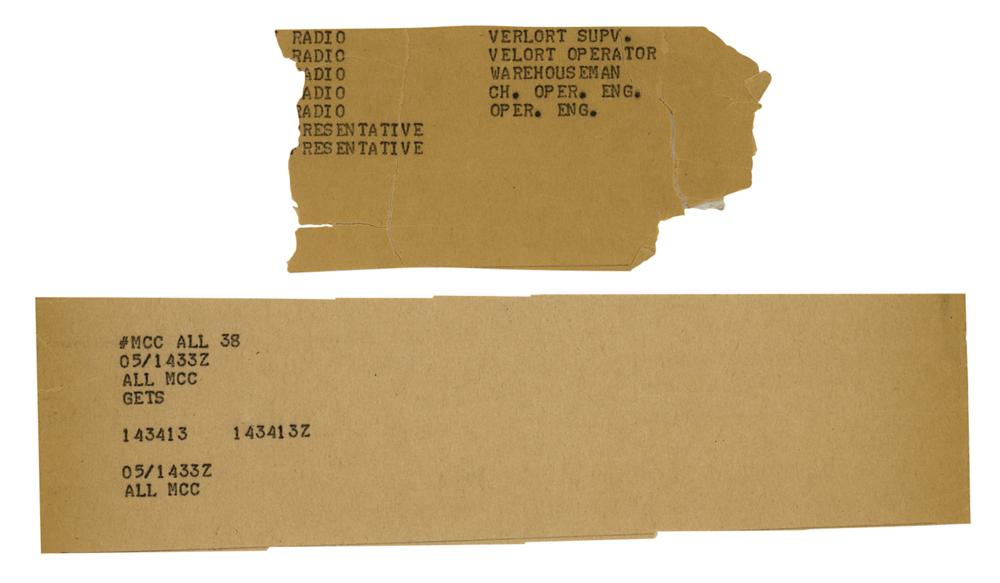 Two original cutouts from the 14-foot-long teletypewriter printout used at the Canary Island tracking station for ‘Test 108,’ the Mercury-Redstone 3 space flight that carried astronaut Alan Shepard into outer space inside his Freedom 7 capsule on May 5, 1961. The two fragile sheets measure 4.5 x 2.25 and 8.5 x 2.25 and are accompanied by a detailed letter of authenticity signed by aerospace memorabilia specialist Ken Havekotte, who states: “The printout, covering from the time Shepard entered the capsule on the launchpad to his ocean landing after his 15-minute suborbital space feat, had been saved by The Bendix Corp. Telemetry Supervisor, John Marlowe, during his tenure there from 1958 - 1961.” In very good to fine condition, with a tear and edge loss to the smaller slip.
