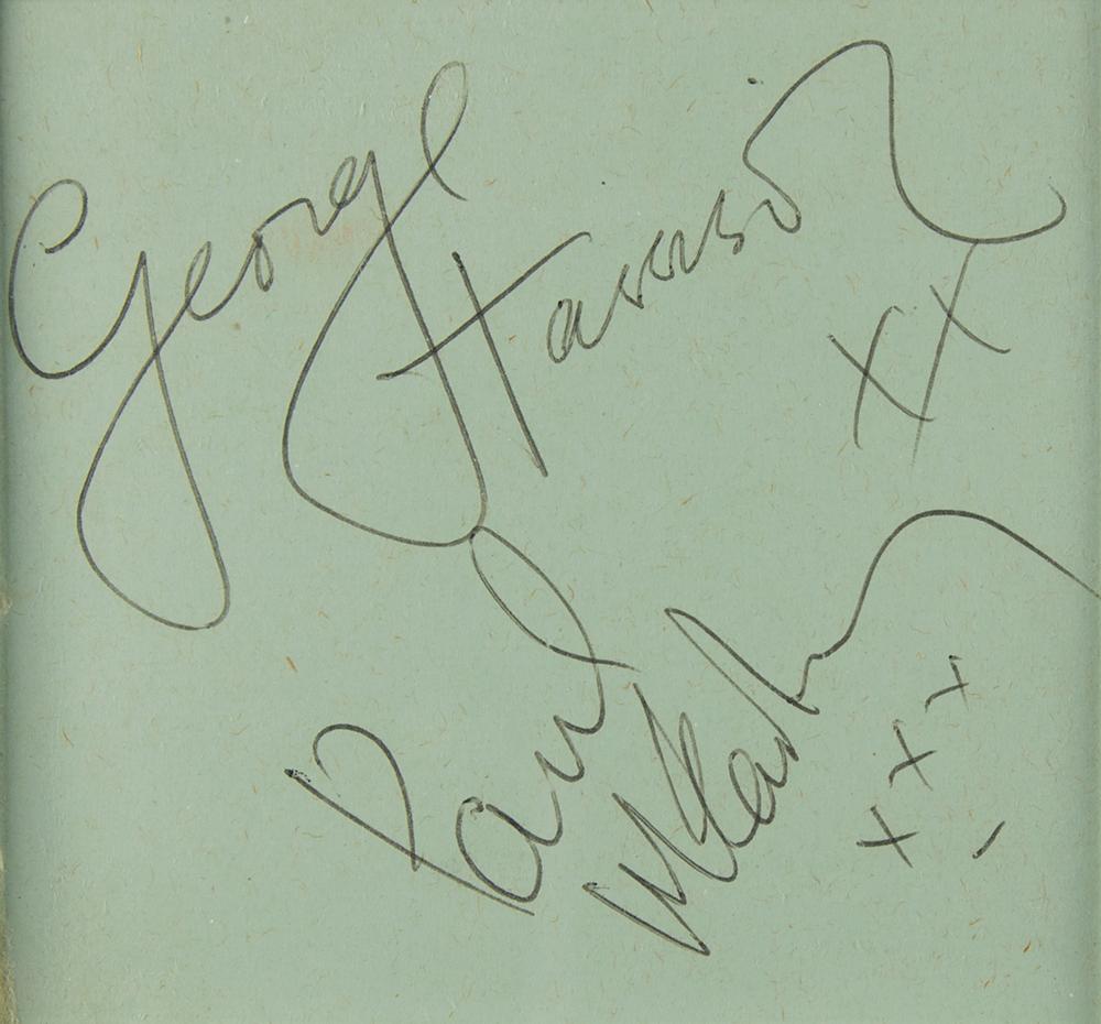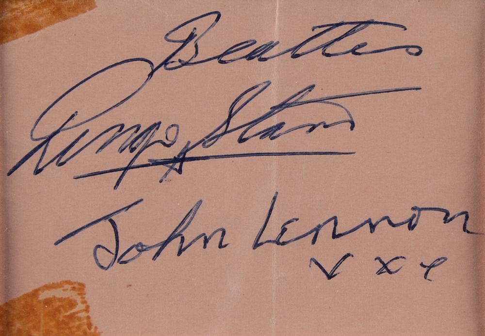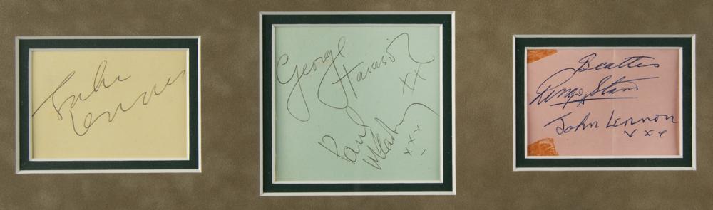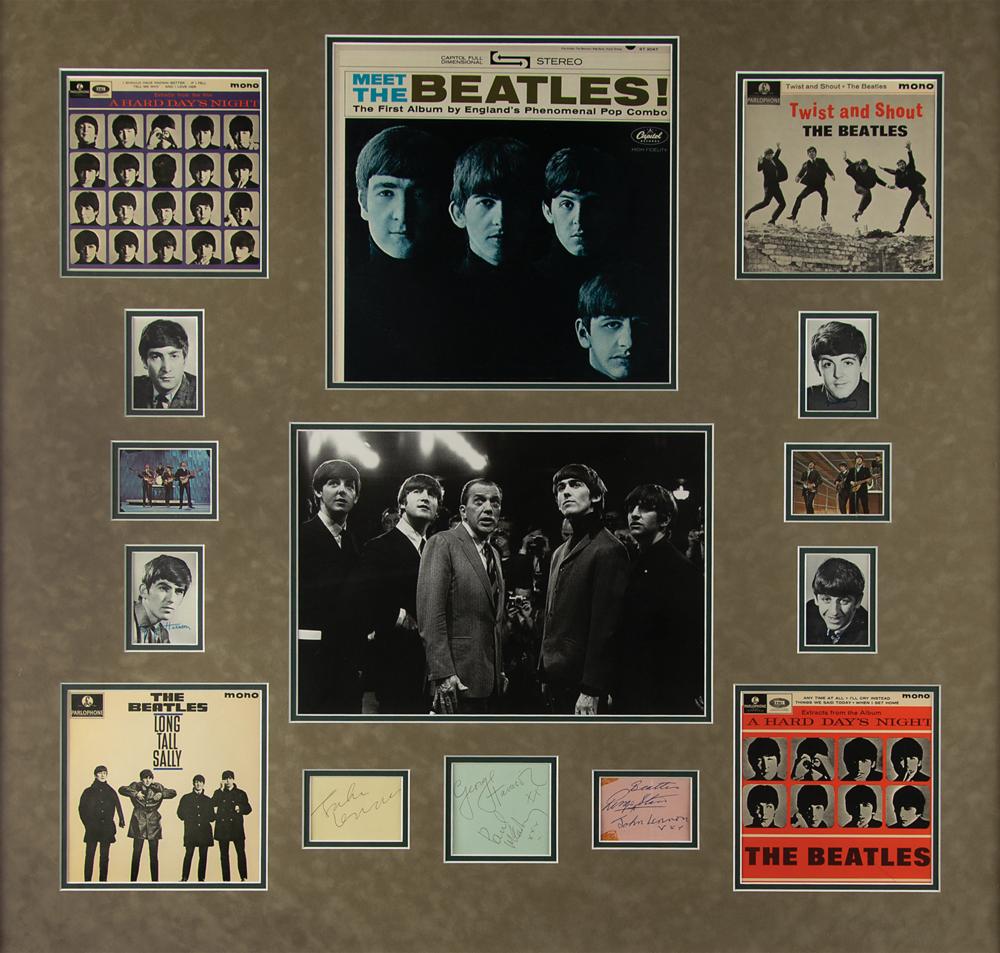 Glorious Beatles display of early 1960s ballpoint autographs, “John Lennon,” “George Harrison, xx” and “Paul McCartney, xxx,” and “Beatles, Ringo Starr,” who adds his own version of Lennon’s signature below, on three multi-colored album pages ranging in size from 3.25 x 2.5 to 3.5 x 3.5. The signed pages are impressively double-matted alongside an attractive array of Beatles recordings, trading cards (with facsimile autographs), and a large photo of the band with Ed Sullivan, all of which are framed together to an overall size of 45.5 x 44. In overall very good to fine condition, with a central vertical fold, and corner tape stains, to the Ringo signature. The records are included (housed in their original sleeves), as is the original autograph book from which the signatures were removed. A terrifically large signature display that captures the enormity of Beatlemania.