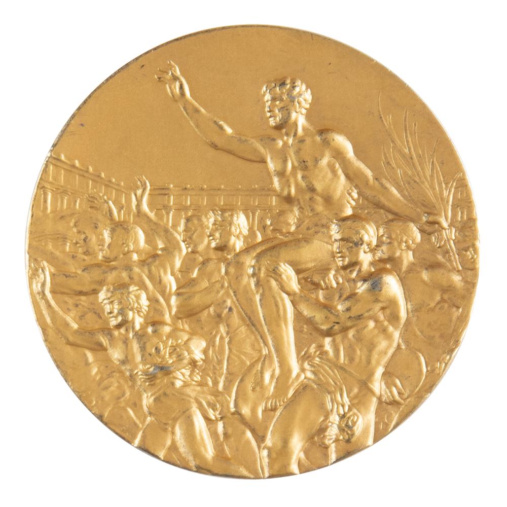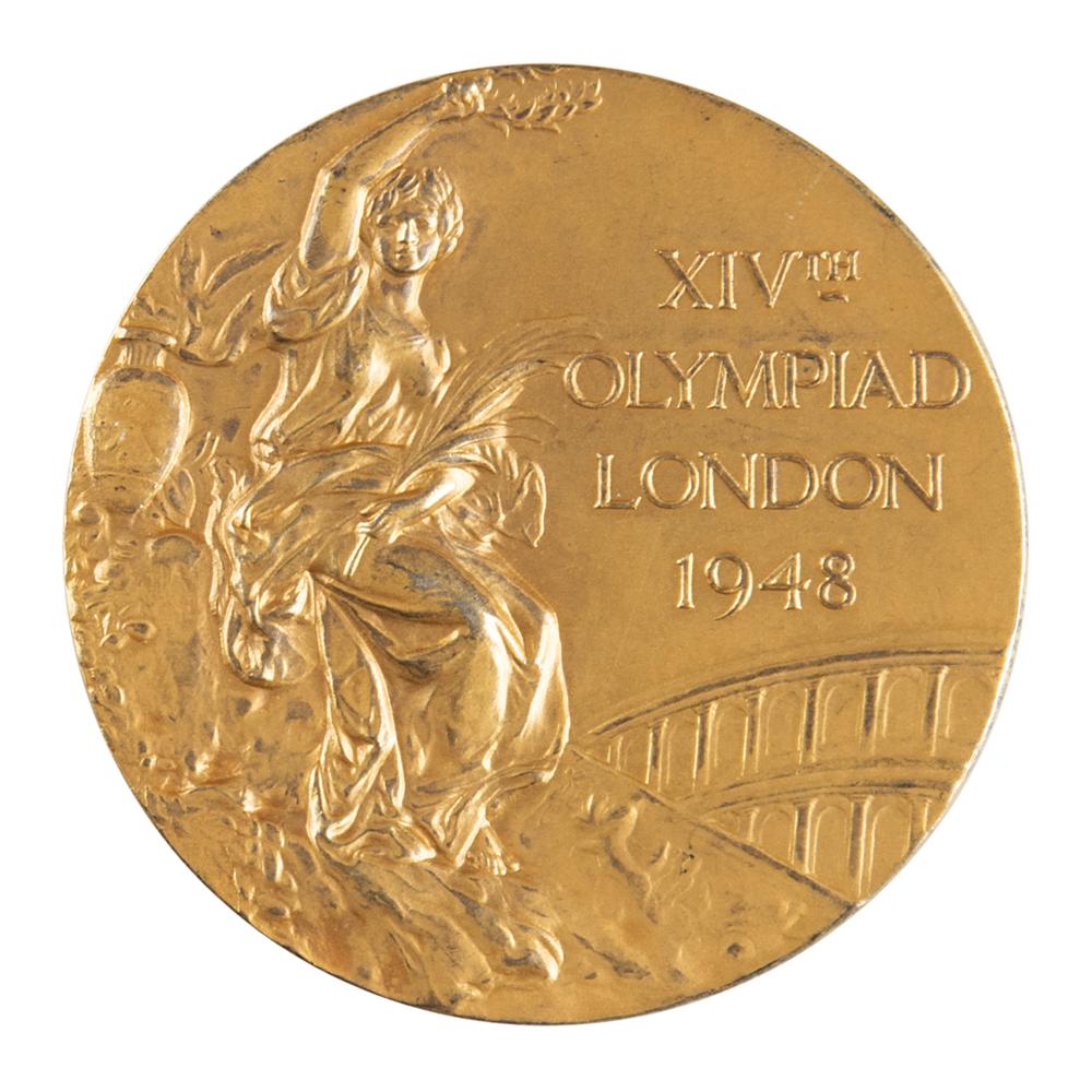 Winner's medal issued for the London 1948 Summer Olympics. Gilt silver, 51 mm, 69 gm, by Giuseppe Cassioli. The front, inscribed, "XIVth Olympiad, London, 1948," features a 'Seated Victory' with the Coliseum in the background; the reverse portrays a winner carried by jubilant athletes. The medal exhibits only minor rubbing to gilt. A classic gold medal from a truly momentous Olympiad—the London Games represented the first Summer Olympics since 1936 after a twelve-year hiatus due to World War II. With only 138 first-place winner's medals awarded, they remain quite scarce and are rarely seen in such fine condition.