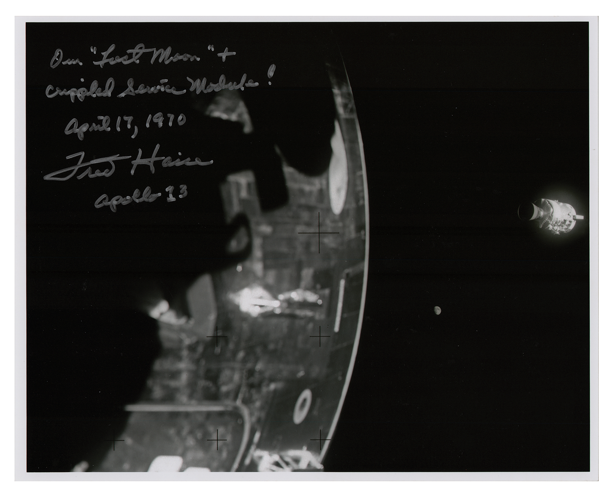 Highly appealing satin-finish 10 x 8 photo as taken from the lunar module 'lifeboat,' which shows the damaged service module and the moon, signed in silver ink, "Our 'lost moon' + crippled Service Module! April 17, 1970, Fred Haise, Apollo 13." In fine condition.