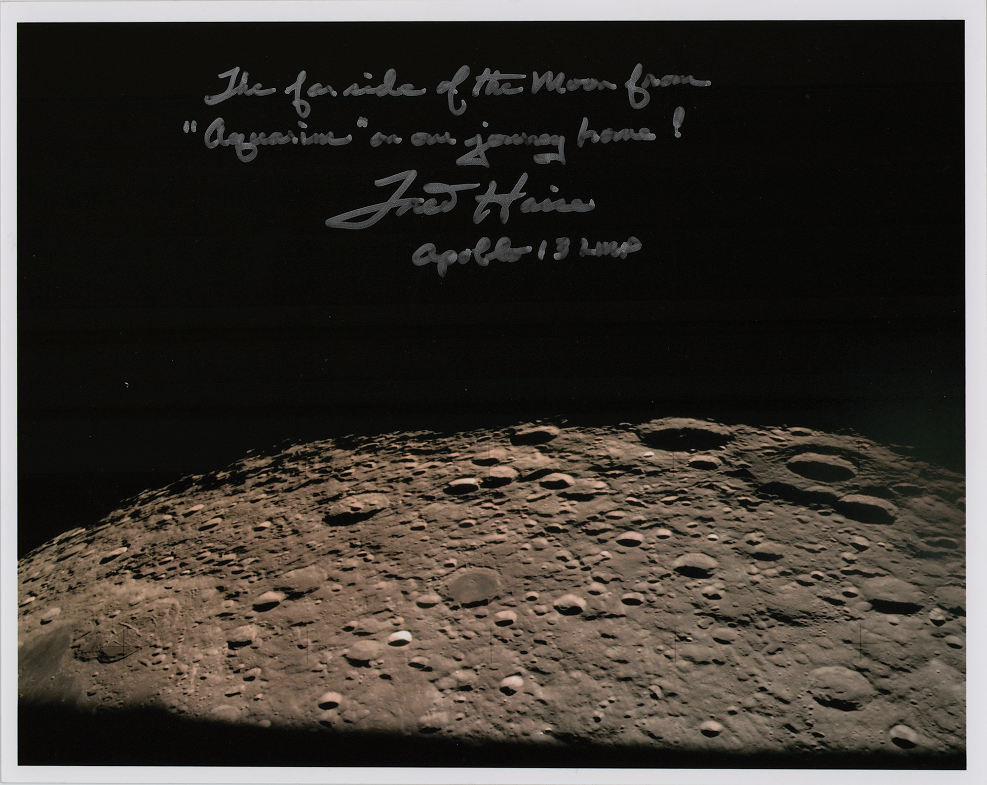 Color satin-finish 10 x 8 photo of the cratered lunar surface, signed in silver ink, "The far side of the moon photo from 'Aquarius' on our journey homeward! Fred Haise, Apollo 13 LMP." In very fine condition.