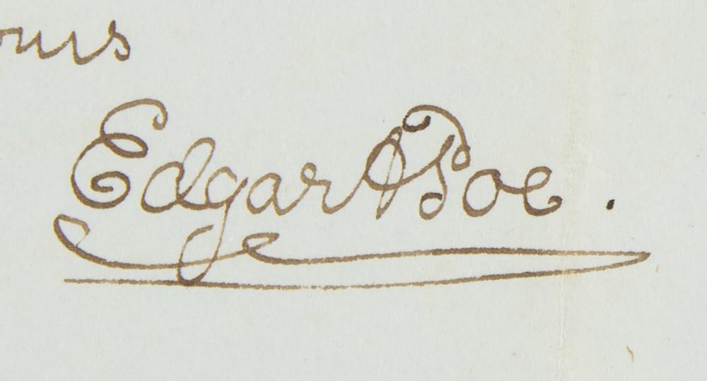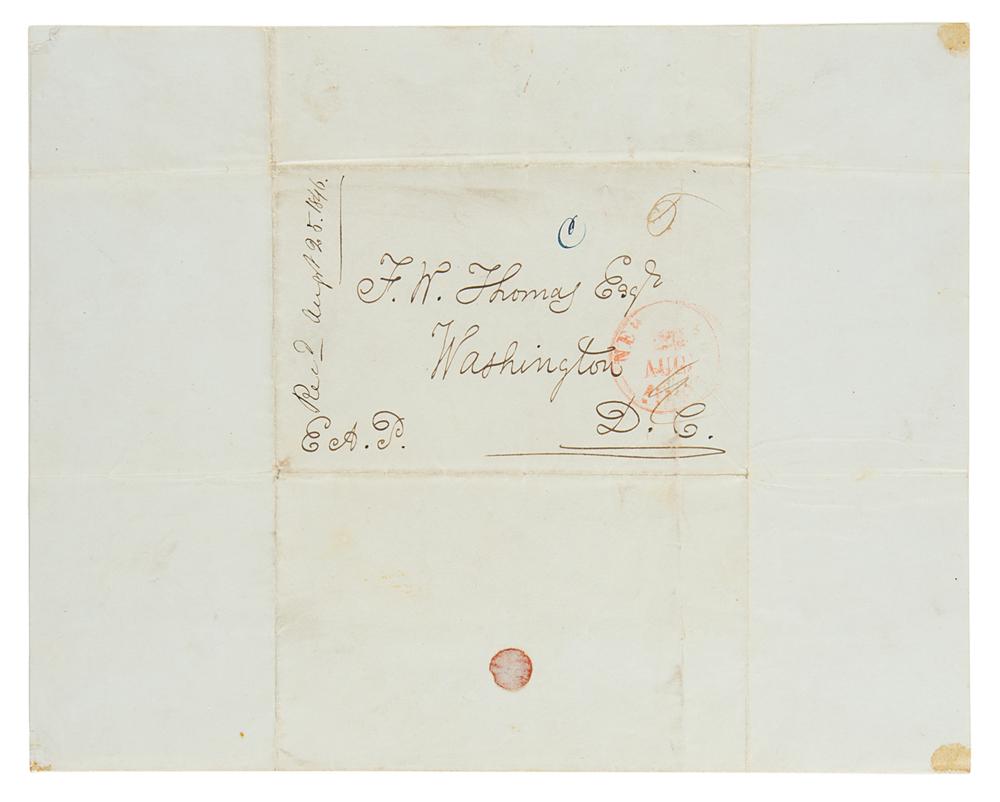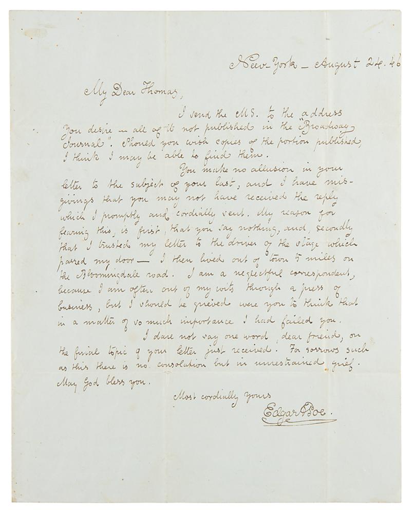 Rare ALS signed “Edgar A. Poe,” one page, 7.75 x 9.75, August 24, 1846. Addressed from New York, a handwritten letter to writer Frederick William Thomas, who, from 1841 until 1850, worked as a clerk in the United States Department of the Treasury in Washington, D.C., for which he selected a library. The letter, in full: “I send the MS. to the address you desire—all of it not published in the ‘Broadway Journal.’ Should you wish copies of the portion published, I think I may be able to find them. You make no allusion in your letter to the subject of your last, and I have misgivings that you may not have received the reply which I promptly and cordially sent. My reason for fearing this is first, that you say nothing, and, secondly that I trusted my letter to the driver of the stage which passed my door—I then lived out of town 5 miles on the Bloomingdale road. I am a neglectful correspondent, because I am often out of my wits through a press of business, but I should be grieved were you to think that in a matter of so much importance I had failed you. I dare not say one word, dear friend, on the final topic of your letter just received. For sorrows such as this there is no consolation but in unrestrained grief. May God bless you.” The “final topic” to which Poe refers is the tragic death of Thomas’s sister and her two children, who were all killed in an accident on their return home from India. In his letter, Thomas deemed the event ‘the most awful affliction of my life.’ The reverse of the second integral page is hand-addressed by Poe, who adds his initials to the lower left, "E. A. P." In fine condition. Accompanied by an export certificate from the French Ministry of Culture.