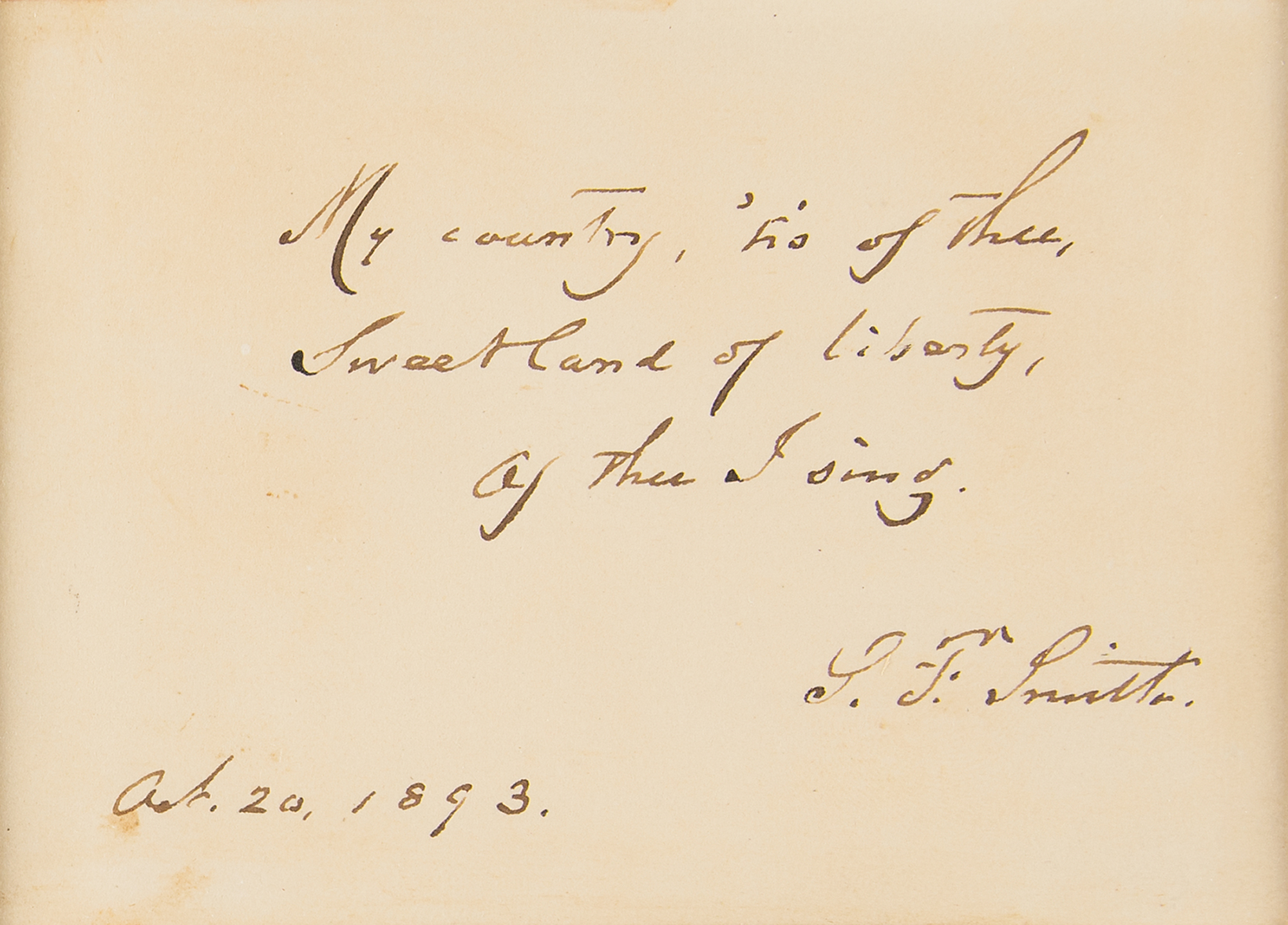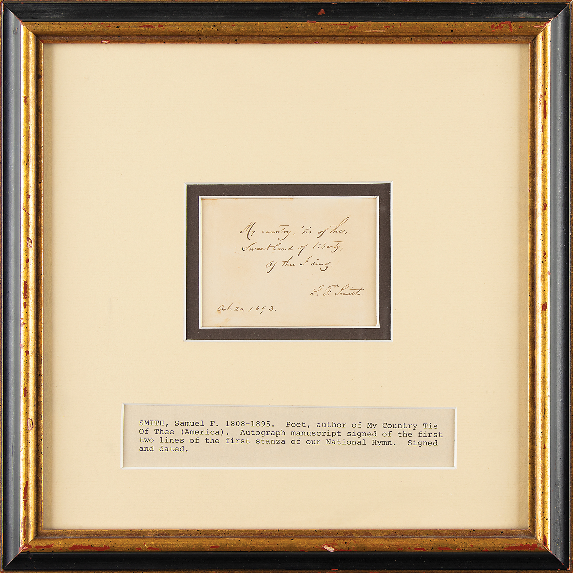 Boston-born Baptist minister and academic (1808-1895) best known as the lyricist of ‘America’ (‘My Country, ’Tis of Thee’), written while he was a student at Andover Theological Seminary. AQS on an off-white 3.5 x 2.5 slip, in full: "My country 'tis of thee, / Sweet land of liberty, / of thee I sing. S. F. Smith, Oct. 20, 1893." Attractively matted and framed with a typed caption to an overall size of 11.25 x 11.25. In fine condition.