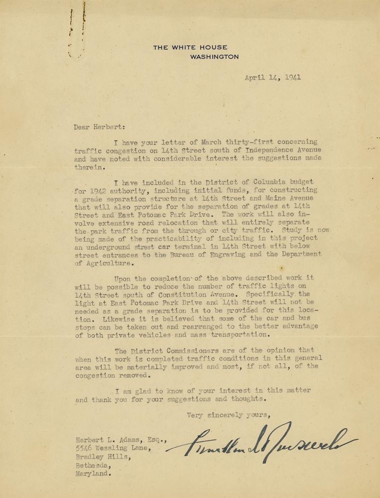 TLS as president, one page, 8 x 10.5, White House letterhead, April 14, 1941. Letter to Herbert L. Adams, in part: "I have your letter of March thirty-first concerning traffic congestion on 14th Street south of Independence Avenue and have noted with considerable interest the suggestions therein. I have included in the District of Columbia budget for 1942 authority, including initial funds, for constructing a grade separation structure at 14th Street and Maine Avenue?The work will also involve extensive road relocation that will entirely separate the park traffic from the through or city traffic. Study is now being made of the practicability of including in this project an underground street car terminal in 14th Street with below street entrances to the Bureau of Engraving and the Department of Agriculture. Upon completion of the above described work it will be possible to reduce the number of traffic lights on 14th Street south of Constitution Avenue?The District Commissioners are of the opinion that when this work is completed traffic conditions in this general area will be materially improved and most, if not all, of the congestion removed." In fine condition, with a rusty paperclip impression to the top edge.