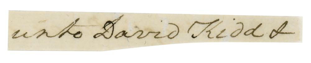 Three words penned in George Washington's hand, "unto David Kidd &," on an irregularly trimmed 3 x .5 slip. In fine condition.