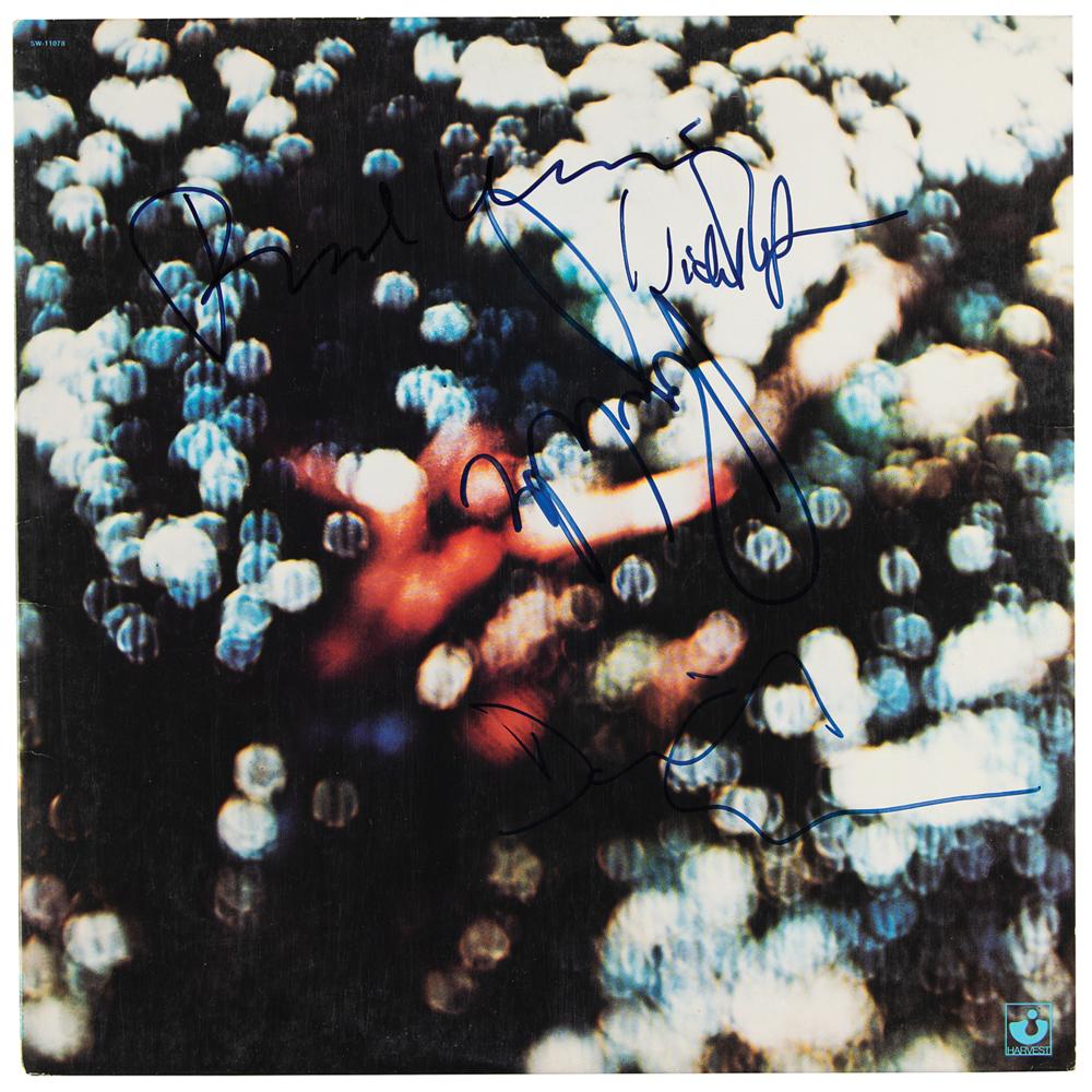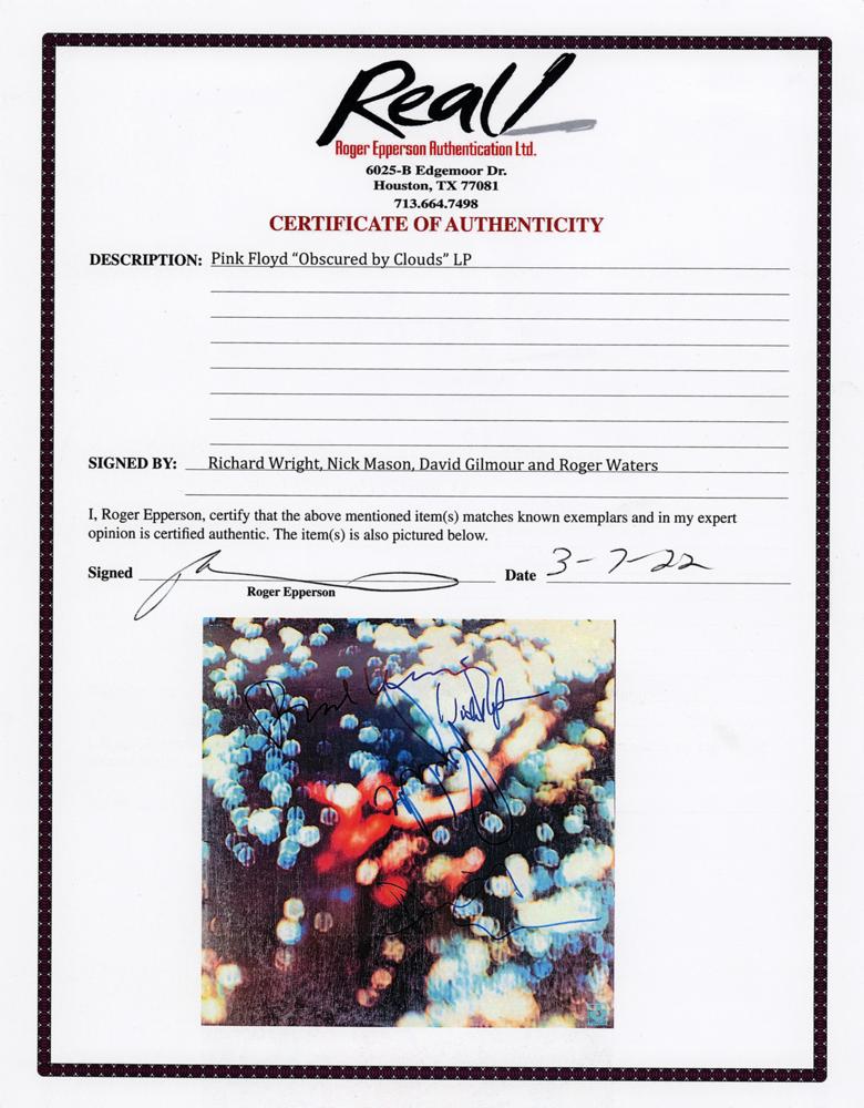 Obscured by Clouds album by Pink Floyd, signed on the front cover in blue felt tip by David Gilmour, Nick Mason, Richard Wright, and Roger Waters. In very fine condition. The record is not included. Accompanied by full letters of authenticity from REAL and JSA. A desirable and uncommon signed Pink Floyd album.