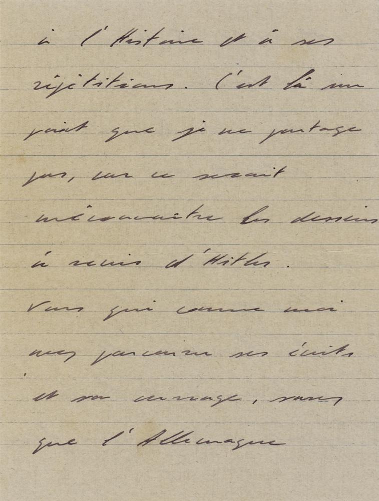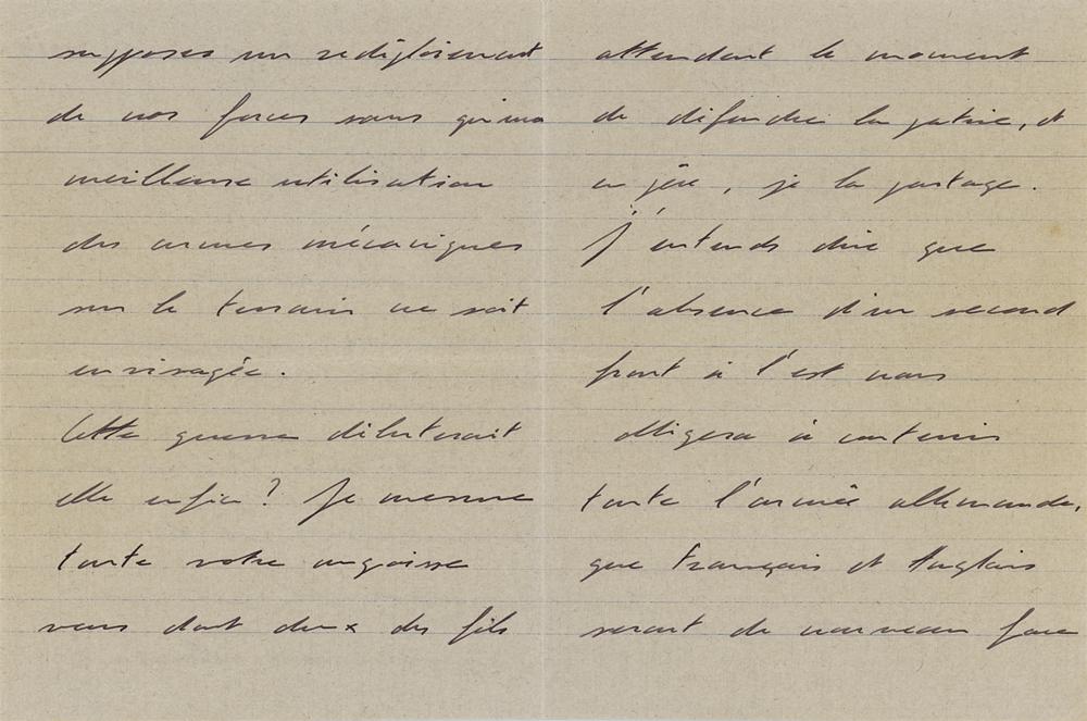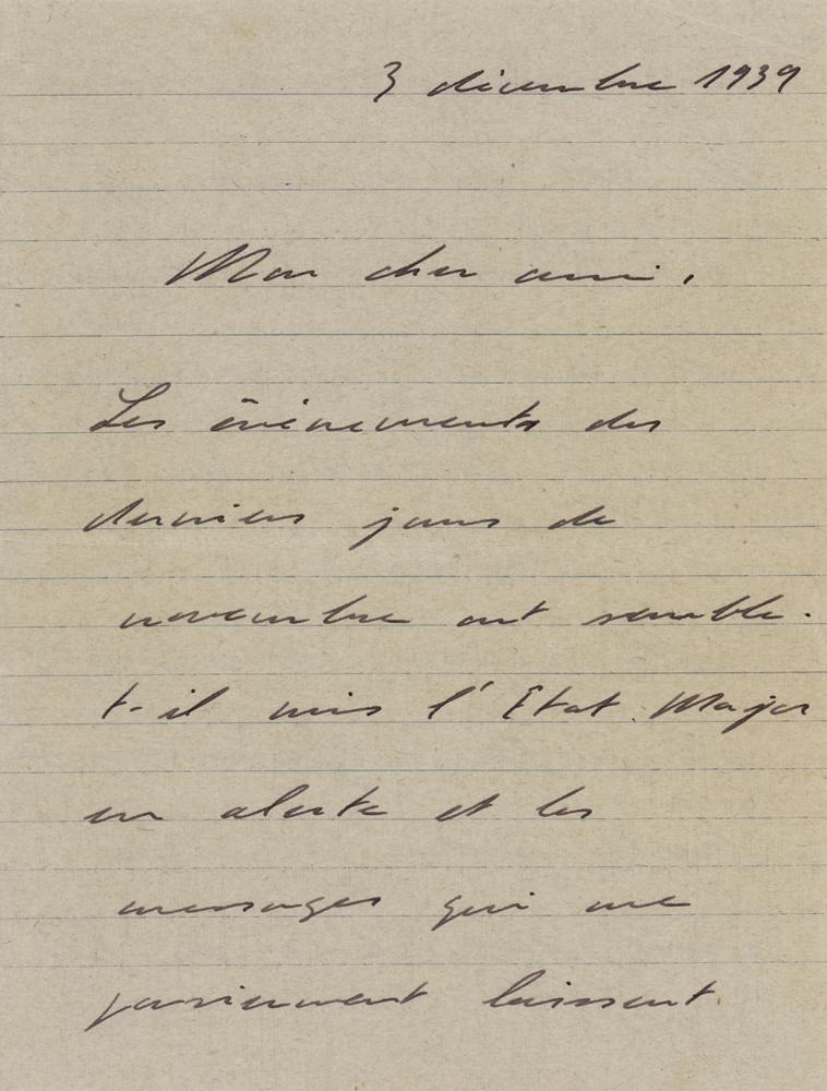 ALS signed “Charles,” ten pages three sets of adjoining sheets, 5.25 x 7, December 3, 1939. Handwritten letter to a friend, commenting on his new understanding of Adolf Hitler's designs following a reading of Mein Kampf, and anxiously observing the readiness of Russian forces to the east. In full (translated): "The events of the last days of November have apparently put the General Staff on alert and the lies which reach me suggest a redeployment of our forces without a better use of mechanical weapons on the ground being considered. Will this war finally begin? I measure all your anguish, you two of whose sons are waiting for the moment to defend the fatherland, and as a father, I share it. I intend to say that the absence of a second front to the east will force us to contain the entire German army, that the French and the English will once again be faced with History and its recurrences. This is a point of view that I do not share, because it would be to misunderstand Hitler's intentions. You who, like me, have read his writings and his works [Mein Kampf], know that the new Germany promised to the German people cannot exist if the powerful Russia remains in its eastern marches. The maneuvers carried out by Stalin in Finland and the flaws in the command demonstrate the unpreparedness of the Russian soldiers and their structural weaknesses. By letting his ally wage his own war, the Chancellor and his generals have a remarkable vantage point. This war will be a long one, the time we waste today others are utilizing. History and future generations will never understand that such a large army, uniting the two most powerful countries in the world, preferred waiting to action, thus leaving the enemy the opportunity to organize the front at its sole convenience. My meeting with Daladier [Édouard Daladier, Prime Minister of France who signed the Munich Agreement prior to WWII] was once again postponed without any other date being offered. This is a habit I don't like to be forced into. We are talking about France, the France that five million men are preparing to defend and its officers sit in the waiting rooms in the ministerial salons. I come to wonder about the interest displayed for the President of the Council to see Colonel de Gaulle present to him in person his theories on the fair and proper use of modern weapons. Reynaud has done his best everywhere. I send you my dear Antoine my best memories." In very good to fine condition, with a partial split to the horizontal fold on the second sheet. Although France had declared war on Germany three months prior, very little fighting had occurred after Germany's initial blitzkrieg attack on Poland in September. The period came to be known as the 'Phoney War,' or 'drôle de guerre,' and prompted de Gaulle's inquiry in this letter: "Will this war finally begin?" In the meantime, the Soviets launched an offensive against Finland, and the the Winter War commenced on November 30, 1939—the "events of the last days of November" that put French officials on high alert. In this remarkable, prescient letter, de Gaulle shares his new understanding of Hitler's motives and intentions, while also commenting on the inadequate preparedness of forces at home and abroad. He feels that the Russian army has revealed itself to be structurally inept in Finland, and is troubled by the lackadaisical response of the French and English governments. Further, he knew that the French army would be outgunned by its enemies. De Gaulle had long been an advocate for the development of a modern, mechanized professional army, but met resistance at the highest levels of government. Politician Paul Reynaud, who he mentions here, had been the greatest champion for a robust armored corps within France's political ranks, but had made little progress. In spite of de Gaulle's best efforts, the nation's ill-equipped forces would be overrun by Wehrmacht troops in May and June, leading to French surrender. De Gaulle fled to safety in London, where he established the 'Free France' government-in-exile and supported the resistance in Nazi-occupied France.