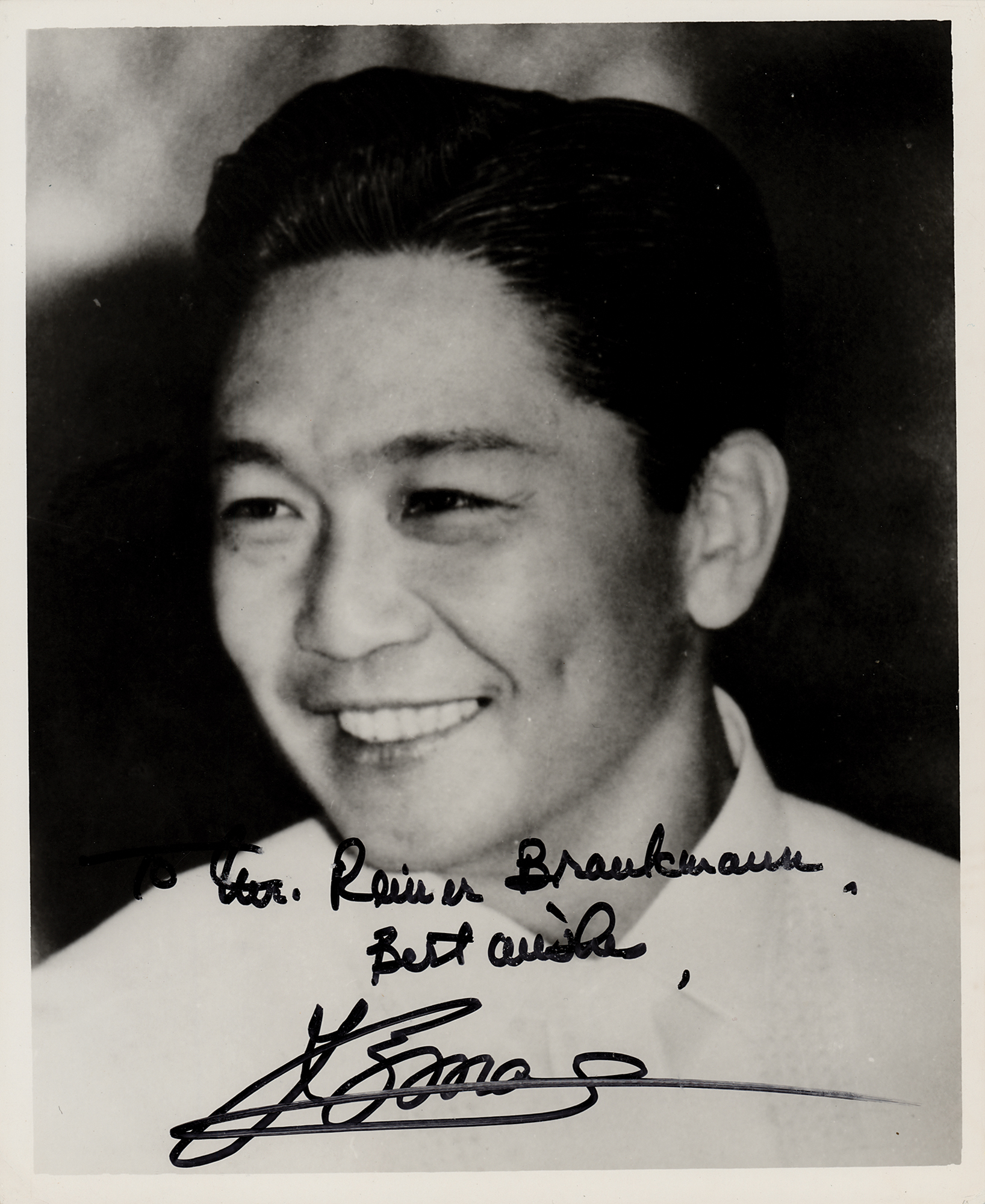 Filipino lawyer and politician (1917-1989) who served as president of the Philippines from 1965 to 1986. Glossy 8 x 10 close-up photo, signed and inscribed in black felt tip, "To Mr. Reiner Braukmann, Best wishes, F. Marcos.” In fine condition, with light surface scuffing and a crease to the lower left corner tip.