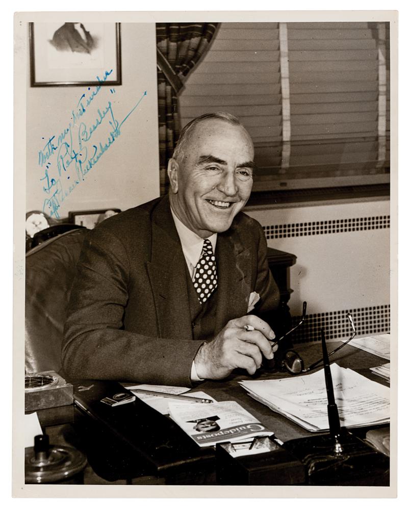Vintage glossy 8 x 10 photo of the celebrated pilot at his desk, signed and inscribed in fountain pen, "With my best wishes to 'Rex Beasley,' Captain Eddie Rickenbacker.” In fine condition, with pin holes to the top corners, and a crease to the lower left corner tip.