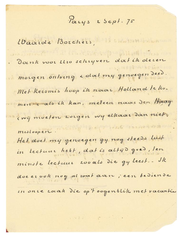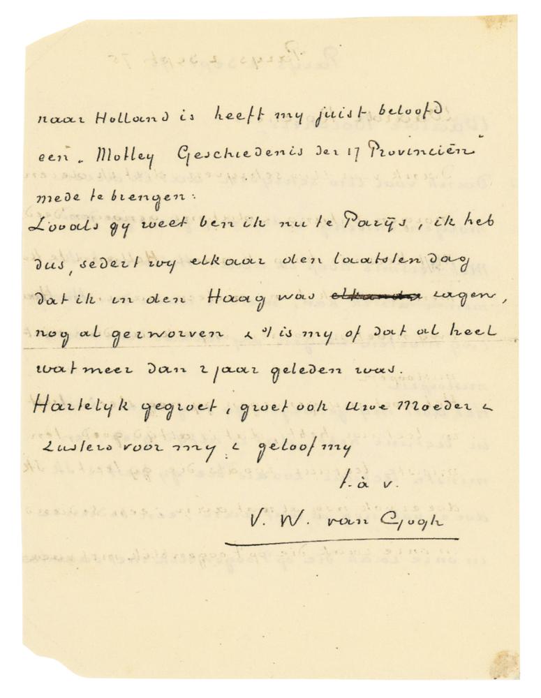 Rare ALS in Dutch, signed “V. W. van Gogh,” one page both sides, 4 x 5.25, September 2, 1875. Handwritten letter to Egbert Borchers, his friend in The Hague. In part (translated): "Thank you for your letter which I received this morning & which pleased me. At Christmas I hope to come to Holland & if I can, straight to The Hague & we must make sure we don't miss each other. I'm glad you still enjoy reading, that's always good, at least reading such books as you read. I'm keeping it up, too; an employee in our business who is currently on vacation to Holland has just promised me to bring me a copy of 'Motley, History of the 17 Provinces.' As you know, I'm in Paris now, so I've been wandering quite a bit since we saw each other on my last day in The Hague & it's as if that was quite a bit more than two years ago." Addressed on the reverse in van Gogh's hand. In fine condition, with minor clipping to two corner tips, affecting nothing. A rare and unusual variation of van Gogh's signature, as most of his letters are signed with just his first name.