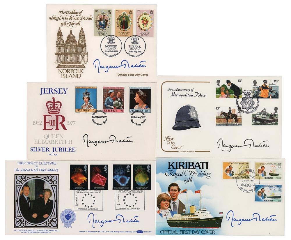 Group of five commemorative covers honoring various occasions, each signed in blue or black felt tip by Margaret Thatcher. Includes: one honoring Queen Elizabeth II's Silver Jubilee; one commemorating the 150th anniversary of the Metropolitan Police; one honoring the third direct elections of the European Parliament; and two different covers commemorating the 1981 marriage of Charles and Diana. In overall fine to very fine condition.