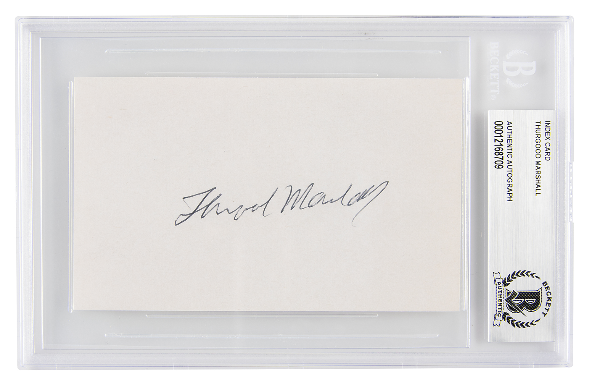 Ballpoint signature, "Thurgood Marshall,” on an off-white 5 x 3 card. In very fine condition. Encapsulated in a Beckett authentication holder.