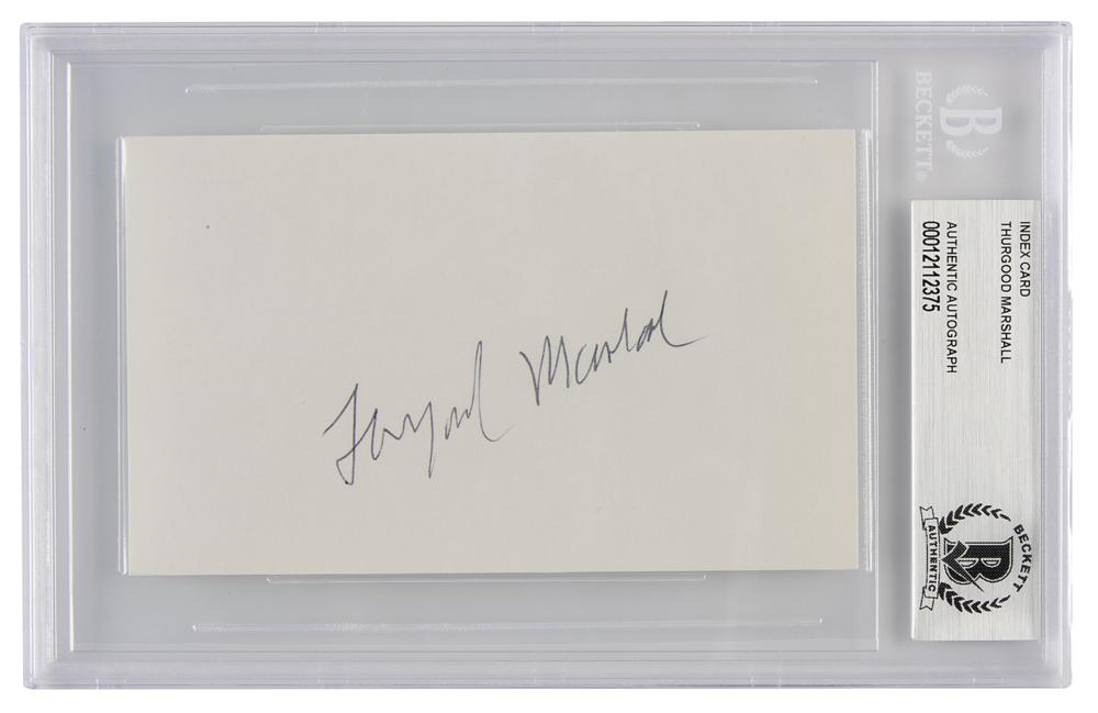 Ballpoint signature, "Thurgood Marshall,” on an off-white 5 x 3 card. In very fine condition. Encapsulated in a Beckett authentication holder.