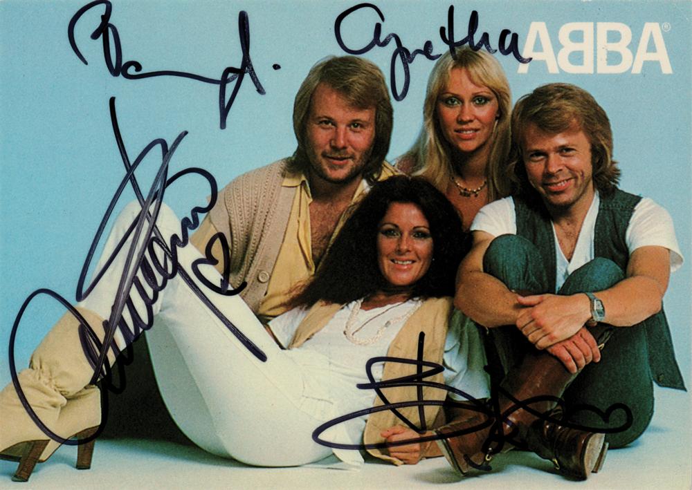 Color semi-glossy 5.75 x 4 Polar Music promotional postcard photo of ABBA seated together, signed in black felt tip by Agnetha Faltskog, Bjorn Ulvaeus, Benny Andersson, and Anni-Frid Lyngstad. In fine condition, with a few light creases.