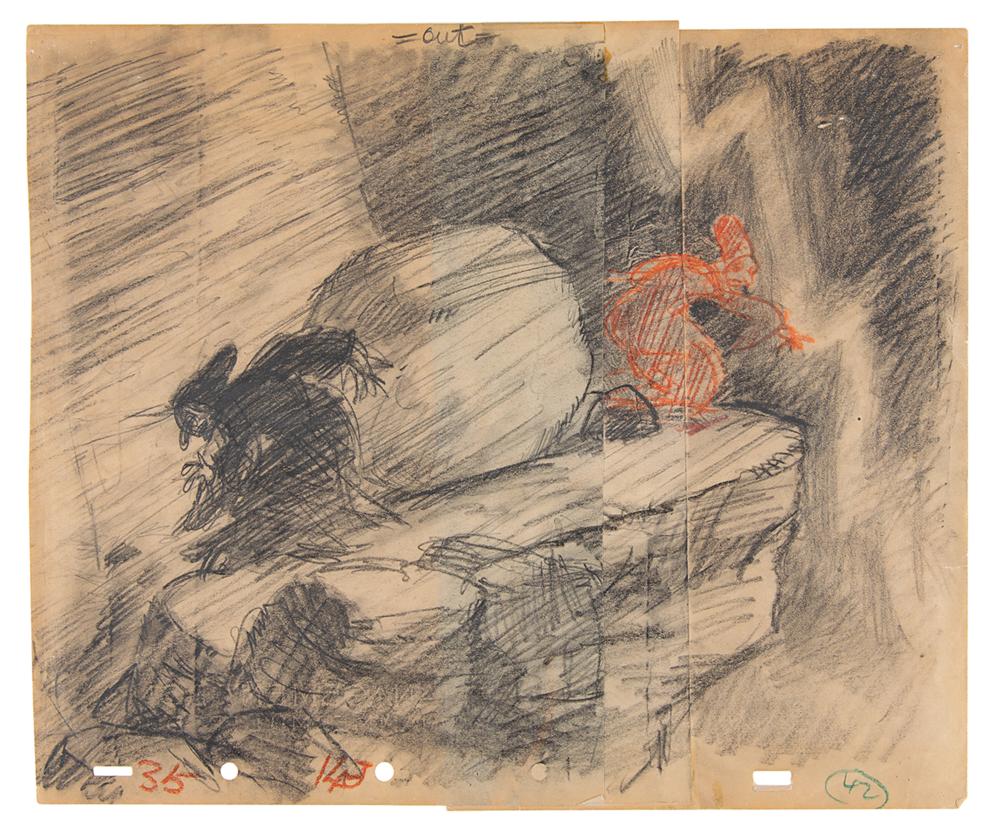 (Walt Disney Studios, 1937) Original production layout drawing featuring the Wicked Witch and a boulder from Snow White and the Seven Dwarfs, showing her movement on the cliff during the storm. Accomplished in graphite and colored pencil on three sheets of animation paper, taped together to an overall size of 12 x 10, marked "42" in the lower right corner. In fine condition, with one tiny edge tear.