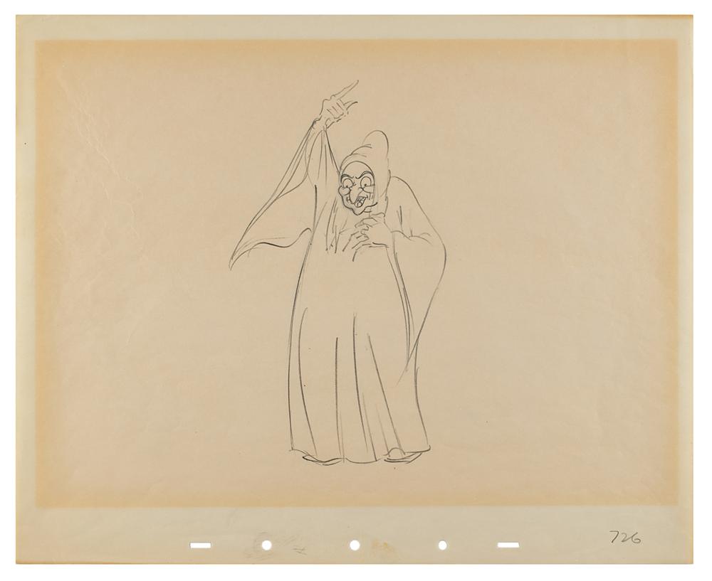 (Walt Disney Studios, 1937) Original rough production drawing featuring the Wicked Witch from Snow White and the Seven Dwarfs, showing her pointing her evil forefinger into the air. Accomplished in graphite on untrimmed 15.5 x 12.5 animation paper, marked "726" in the lower corner. Image measures 5 x 9. In fine condition, with a block of uniform toning from prior display. A great full-figure pose of this classic Disney villain.