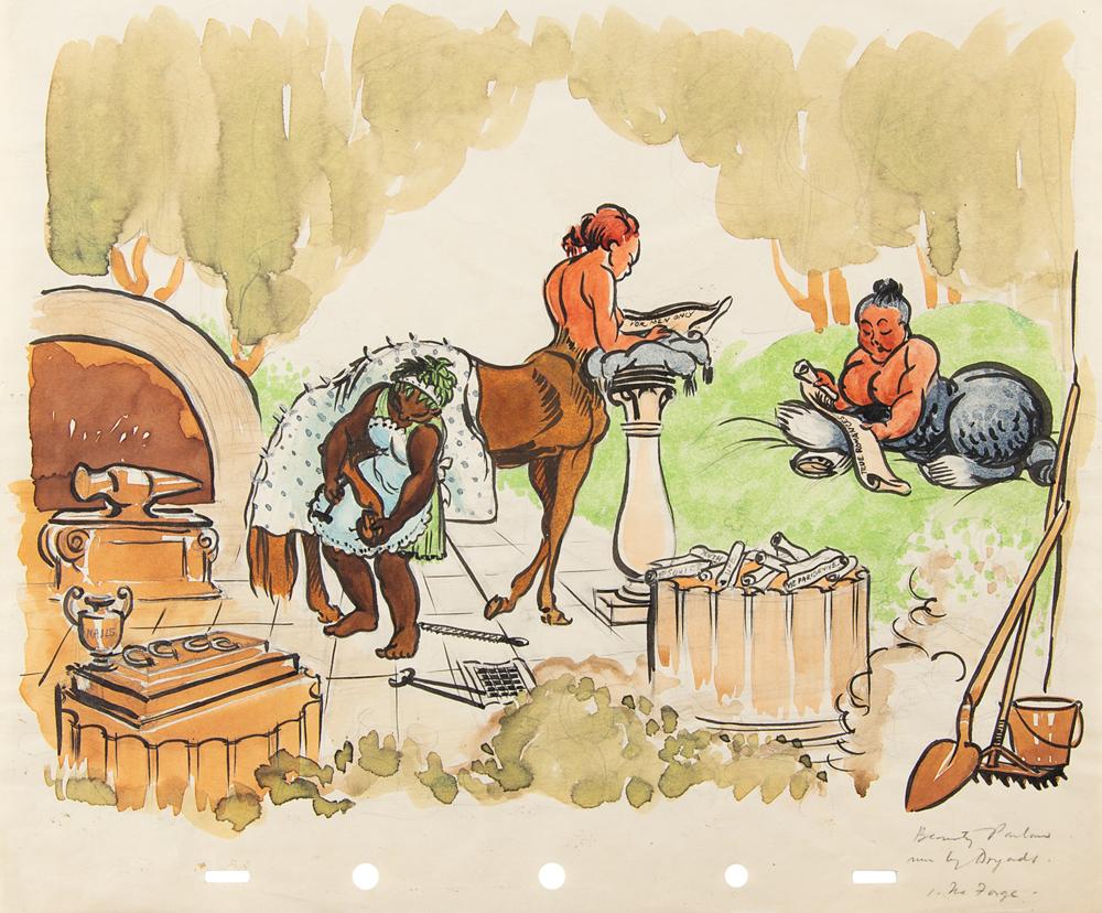(Walt Disney Studios, 1940) Original concept production watercolor painting by Sylvia Holland featuring two centaurettes and a slave from the 'Pastoral Symphony' segment of Fantasia. One centaurette is reading a "For Men Only" scroll, and the other reads one entitled "True Romances"; a slave is hard at work shoeing one of their hooves. Accomplished in watercolor on untrimmed 12 x 10 animation paper. In fine condition. A historic piece of concept artwork for a scene that was cut from the film.