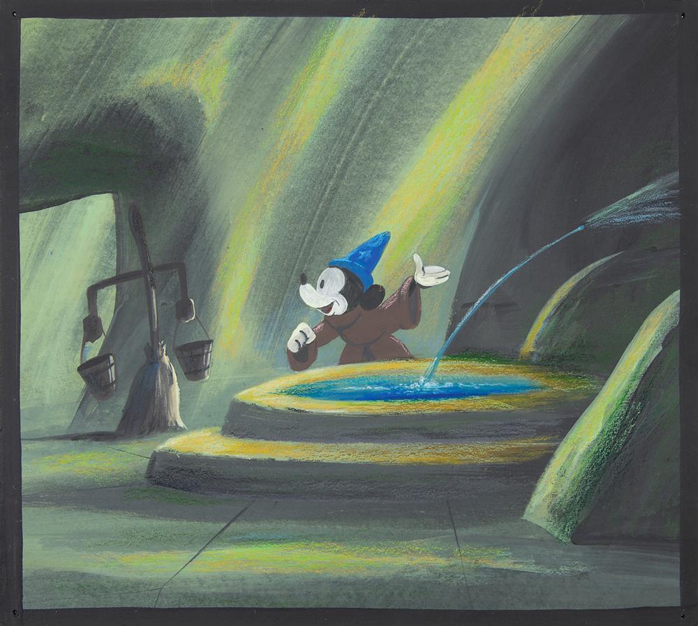 (Walt Disney Studios, 1940) Original concept painting of Mickey Mouse from the 'Sorcerer's Apprentice' segment of Fantasia, which shows the young wizard-to-be in Yen Sid's hat, directing the broom to carry water to the basin pool. Accomplished in gouache on black 9.25 x 8.25 artist's board. In fine condition, with tack holes to corners. A well-done piece of concept art from a Disney classic.