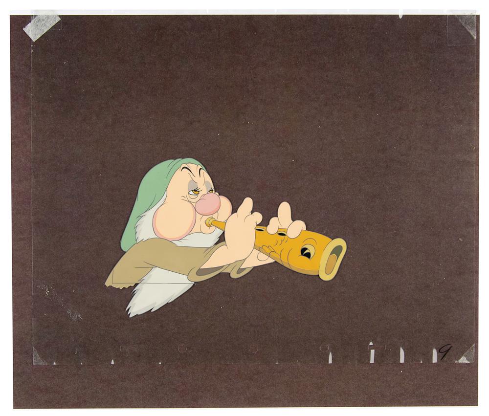 (Walt Disney Studios, 1937) Original production cel featuring Sleepy from Snow White and the Seven Dwarfs, showing him playing a fish flute during the dwarfs' yodel song sequence. Image measures 6.5 x 4.25, with overall dimensions of 12 x 9.75. In fine condition.