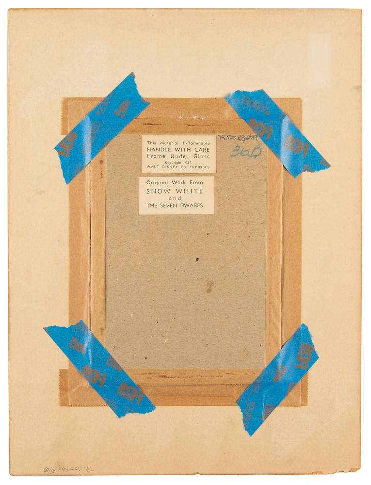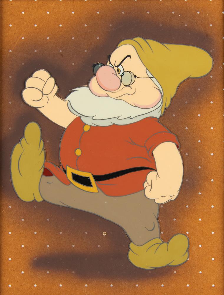 (Walt Disney Studios, 1937) Original production cel featuring Doc from Snow White and the Seven Dwarfs, showing him getting ready to box. The cel has been trimmed and applied to an airbrushed background as prepared by Courvoisier Galleries for sale. Image measures 4.25 x 4.75, with a mat opening of 4.75 x 6.25. Matted to 9.5 x 12.5. The piece has the original Disney Courvoisier Galleries labels on the reverse. In very good to fine condition, with dampstaining to the mat