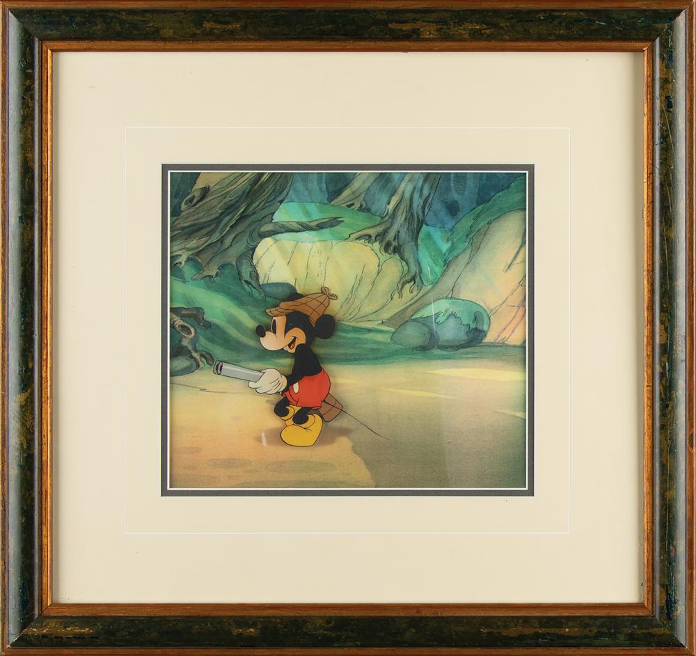 (Walt Disney Studios, 1937) Original production cel featuring Mickey Mouse holding a shotgun and wearing a hunting cap from Lonesome Ghosts, placed on a hand-painted watercolor production background from Little Hiawatha. Image measures 4.5 x 4, with a mat opening of 8.75 x 7.75. Framed to an overall size of 17.25 x 16.25. In fine condition. A unique and desirable set-up, combining production art from two separate classic Disney shorts.