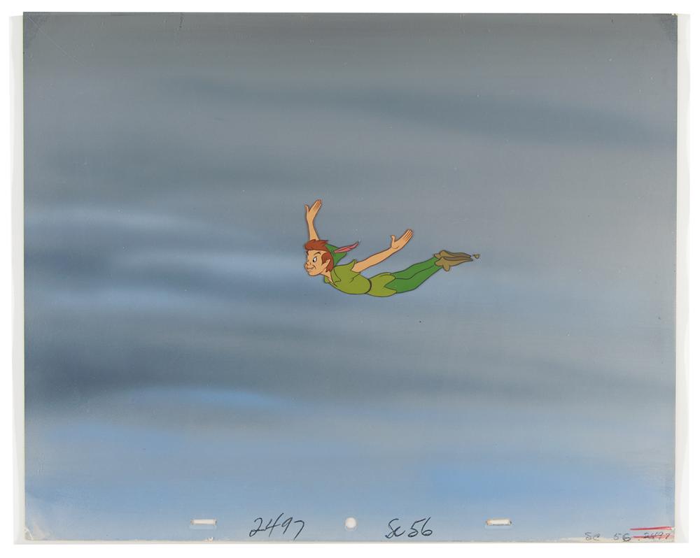 (Walt Disney Studios, 1953) Original production cel from Peter Pan, featuring Neverland's title character soaring through the air against a gray dusky sky. The cel is placed on a hand-painted Disney production background from the same period. Image measures 4 x 2.5, with overall dimensions of 16 x 12.75. In fine condition. A great set-up featuring a Disney icon.