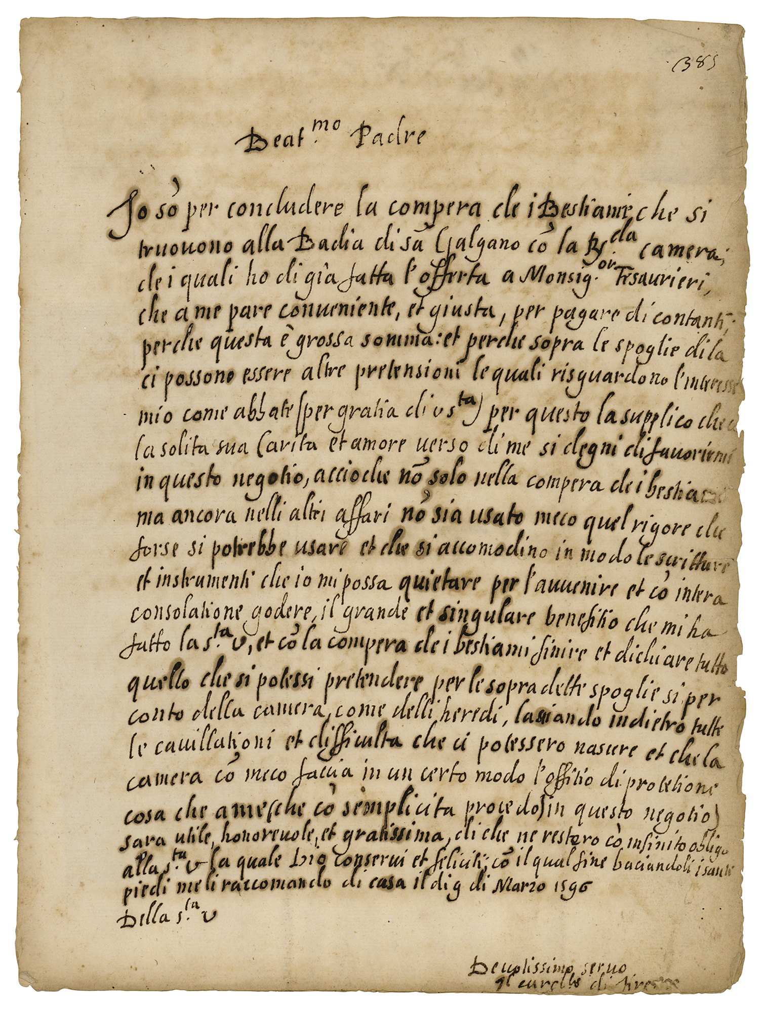 Born Alessandro Ottaviano de Medici in 1535, he served as pope from April 1-27, 1605; his pontificate is one of the briefest in history, having lasted under a month. Incredibly rare ALS in Italian, signed “Il Card. di Firenz,” one page, 8 x 11, March 10, 1596. Untranslated handwritten letter to Pope Clement VIII, addressed to "Beat'mo Padre," written by the future Pope Leo XI as Cardinal of Florence. In very good to fine condition, with partial separation along the hinge and some tiny losses to the signature area. An extraordinary piece of papal correspondence.