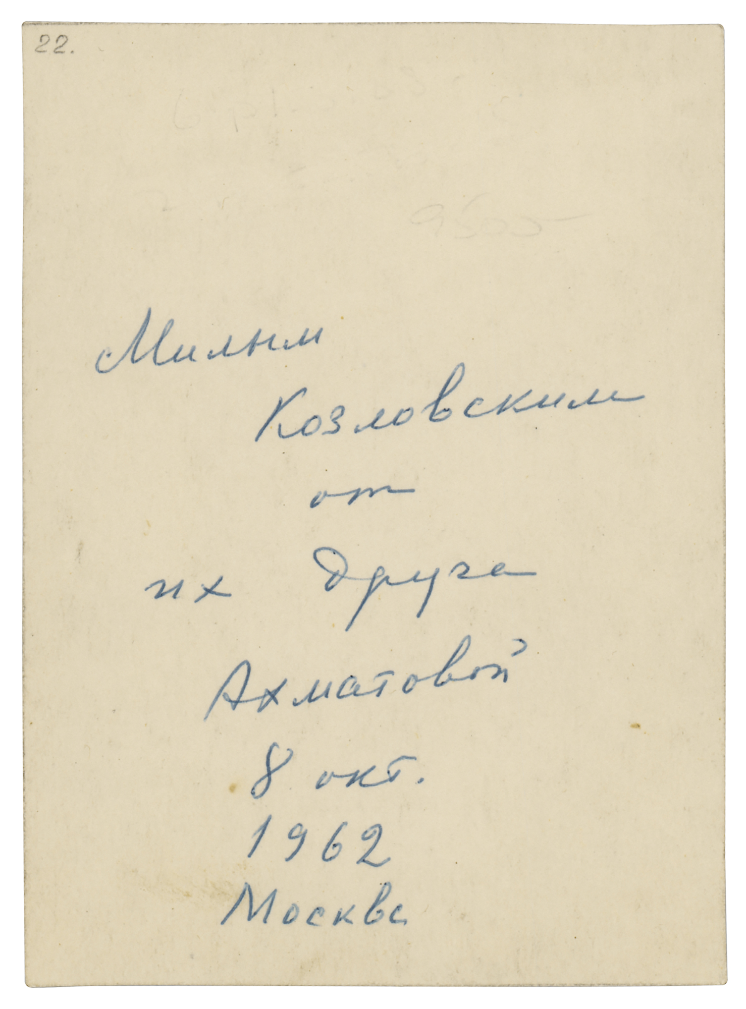 Important Russian poet (1889-1966) whose work was condemned and censored by Stalinist authorities; her emotionally restrained, short lyric poems include meditations on time and memory, and touch upon the difficulties of living and writing in the shadow of Stalinism. Incredibly rare vintage matte-finish 3.25 x 4.5 photo of the great Russian poetess, signed and inscribed on the reverse in blue ballpoint in Cyrillic, and dated at Moscow in 1962. In very fine condition. An incredibly scarce signed photo of the courageous poet, and the very first Akhmatova autograph we have offered.