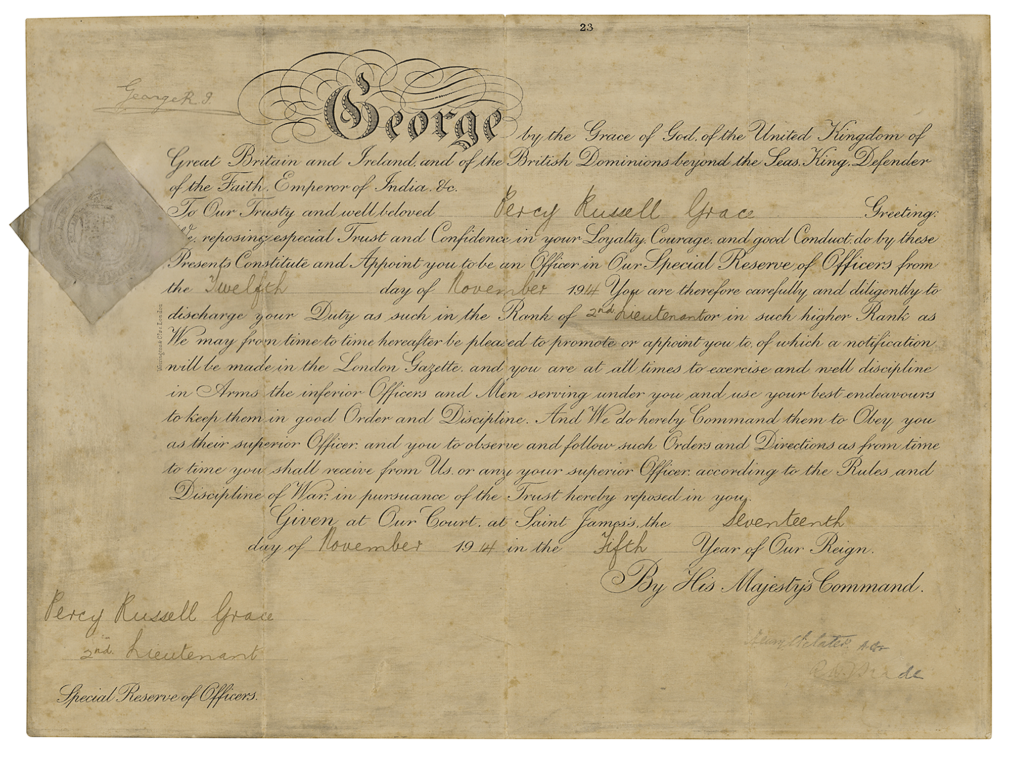 Partly-printed DS, signed “George R. I.,” one page, 16 x 12, November 17, 1914. King George V appoints Percy Russell Grace "to be an Officer in Our Special Reserve of Officers?in the Rank of 2nd Lieutenant." The embossed paper seal affixed to the left side remains intact. In very good to fine condition, with soiling and light staining.