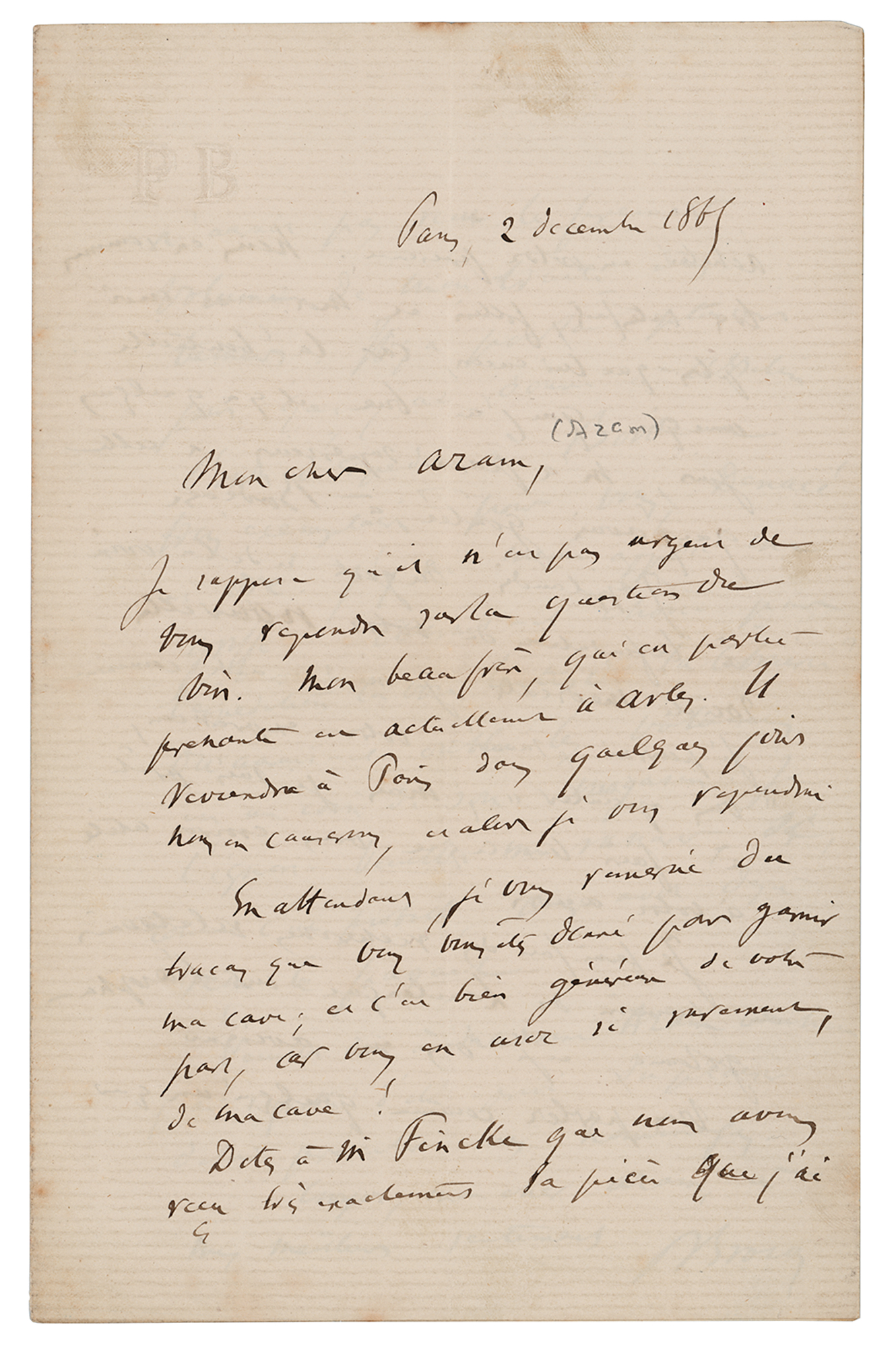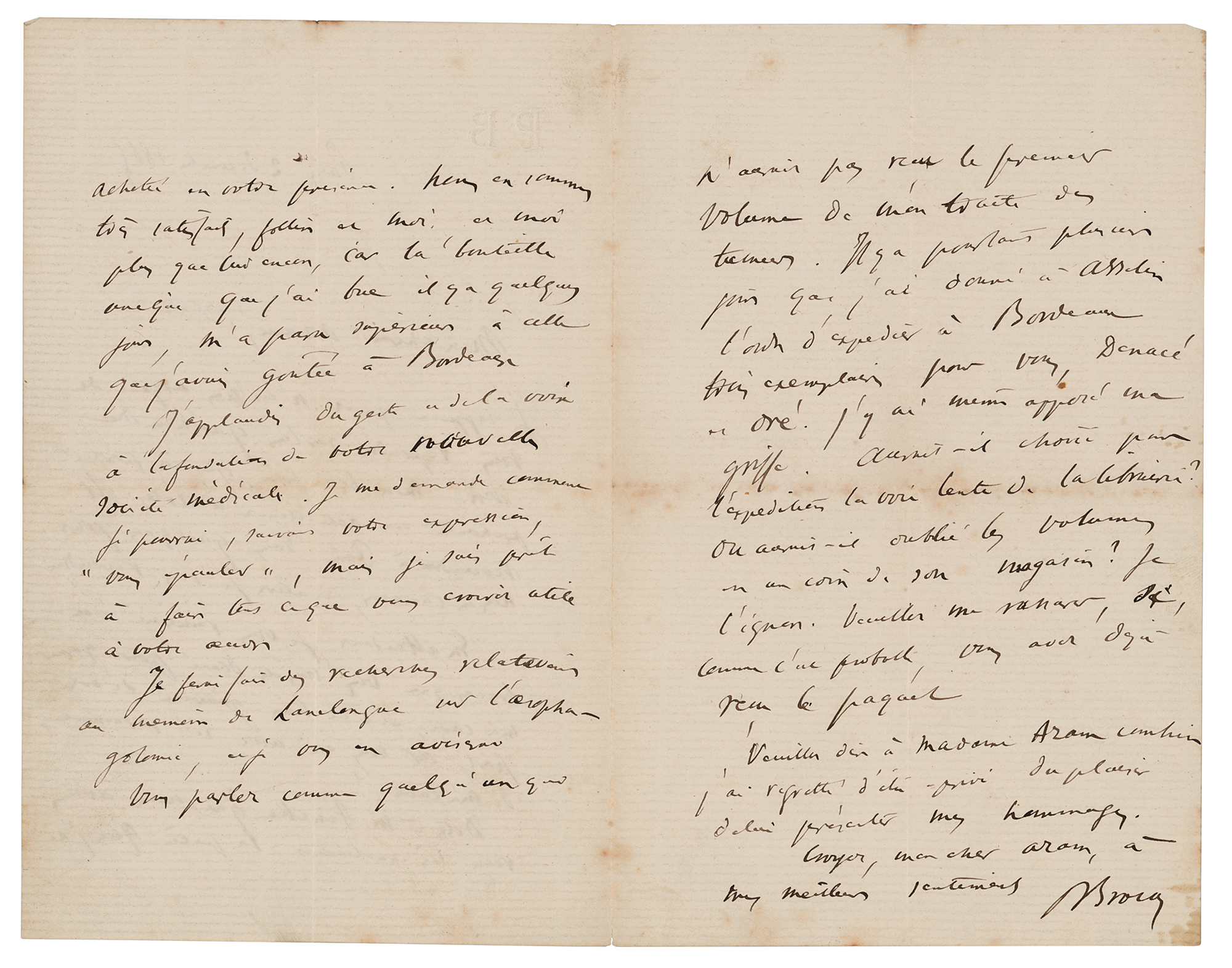 French physician and anthropologist (1824-1880) who discovered the seat of motor control of speech in the brain. ALS in French, signed “P. Broca,” three pages on two adjoining sheets, 5.25 x 8.25, December 2, 1865. Untranslated handwritten letter by Broca. In fine condition.