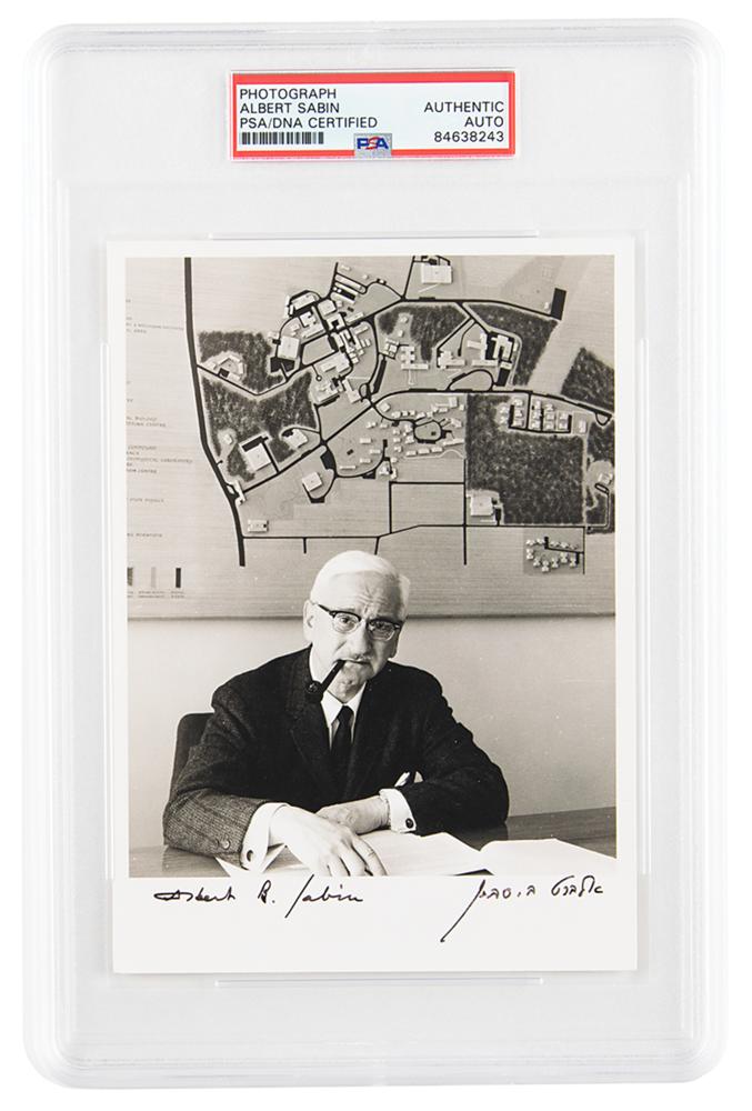 American medical researcher (1906-1993) best known for developing a practical oral polio vaccine. Matte-finish 5 x 7 photo of Albert B. Sabin in his office as president of the Weizmann Institute, signed in the lower border in black felt tip. In very fine condition. Encapsulated in a PSA/DNA authentication holder.