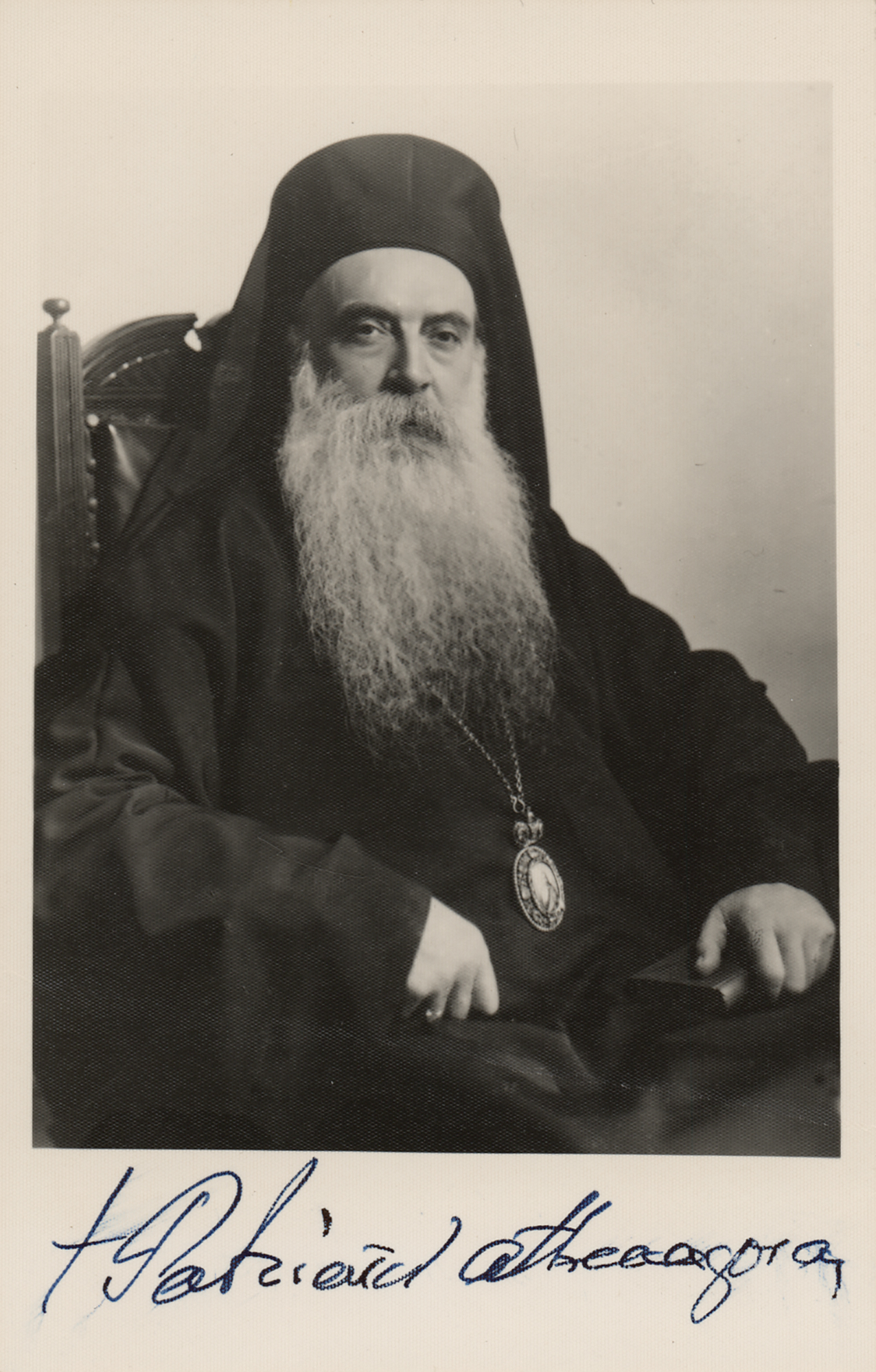 Greek Orthodox bishop (1886-1972) who served as Ecumenical Patriarch of Constantinople from 1948 to 1972. Vintage matte-finish 3.5 x 5.5 postcard photo of the Orthodox leader, signed in the lower border in fountain pen, "Patriarch Athenagoras." In very good to fine condition, with a somewhat unobtrusive crease across the bottom of the image.