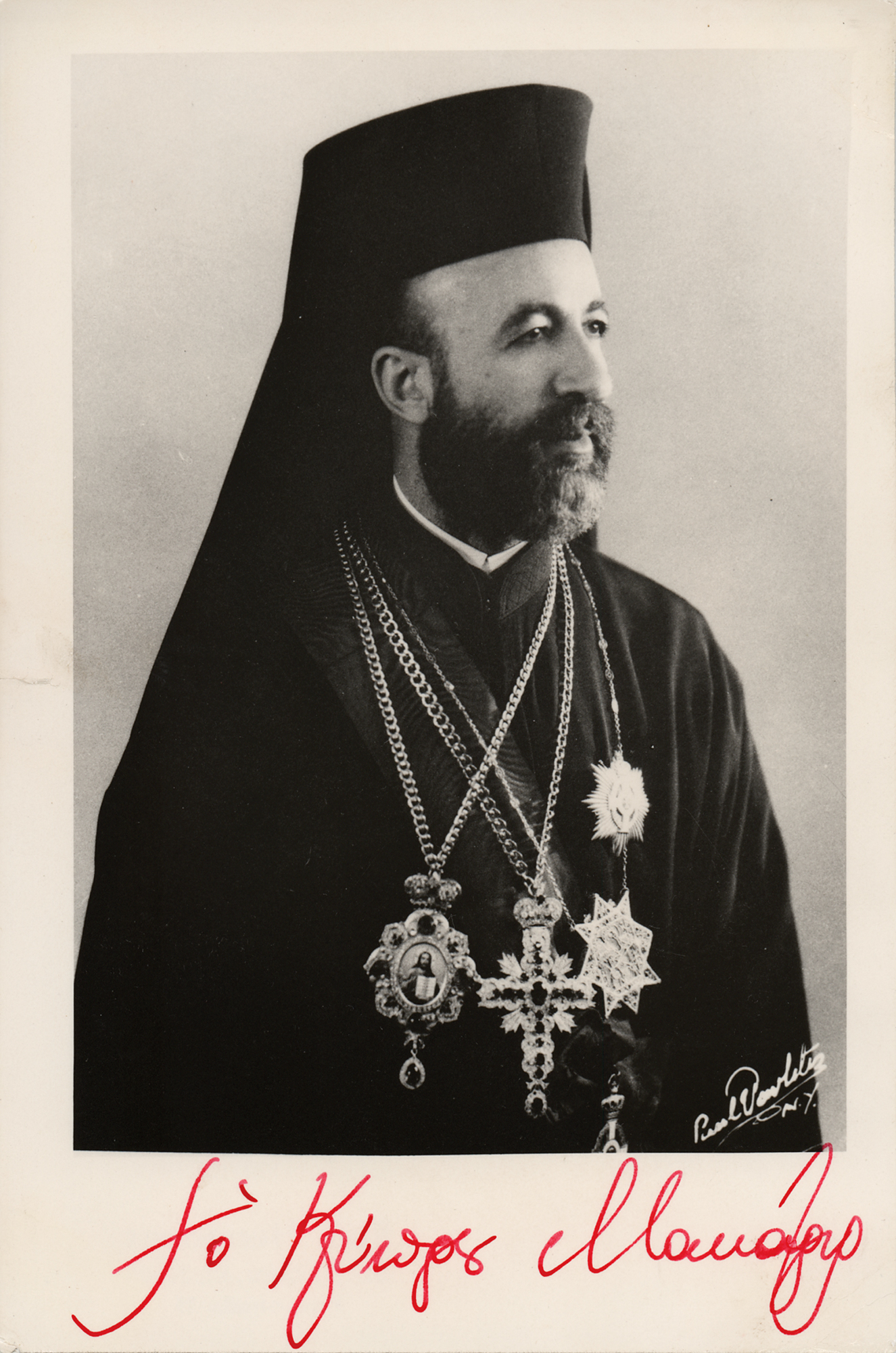 Greek Cypriot clergyman and politician (1913-1977) who became the first president of Cyprus in 1960; during his three terms, he survived four assassination attempts and a coup d'état. Vintage matte-finish 4.75 x 7 photo of Makarios III in his ornate dress, signed in the lower border in red ink. In very good to fine condition, with rippling and creases to the edges.