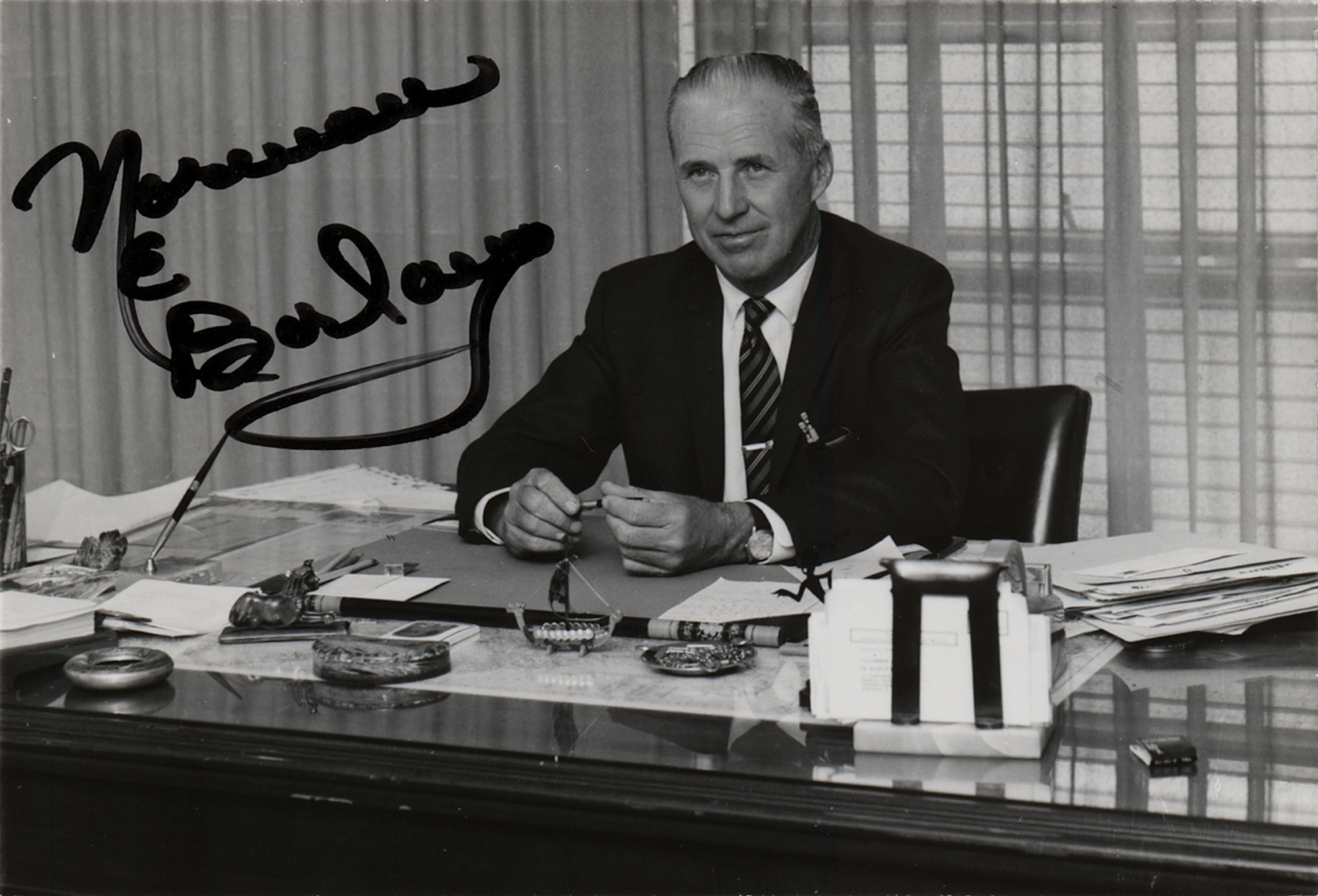 American agronomist (1914-2009) who won the 1970 Nobel Peace Prize for his work related to improving and increasing the world food supply. Glossy 5 x 3.5 photo of the influential agronomist seated at his desk, signed in black felt tip, "Norman E. Borlaug." In fine condition.
