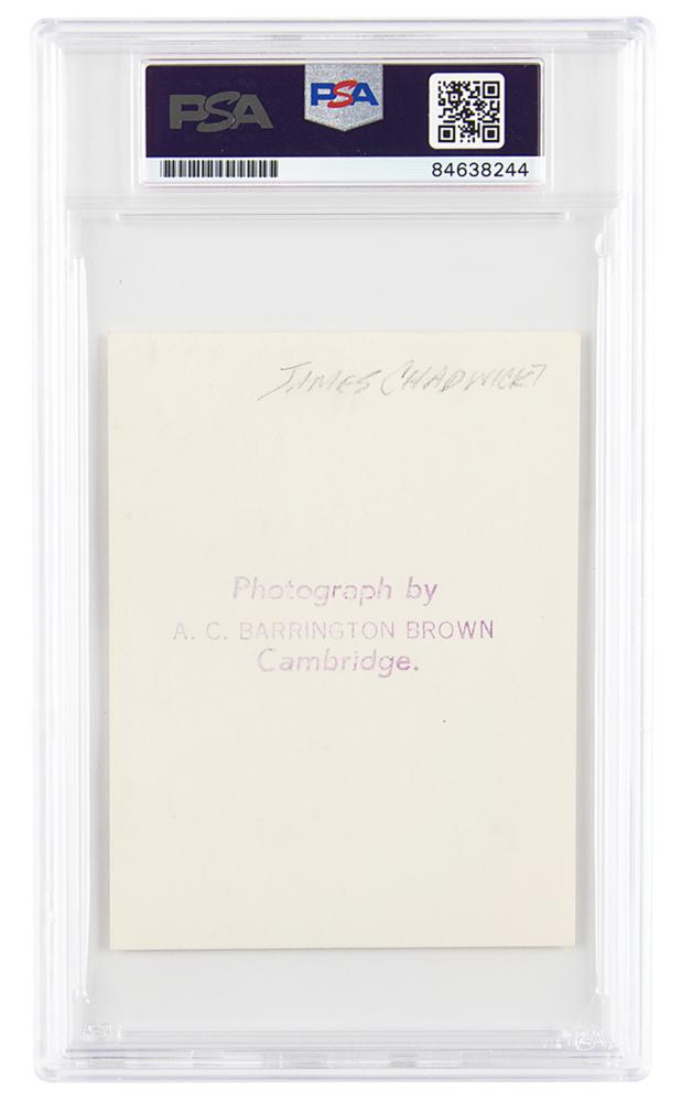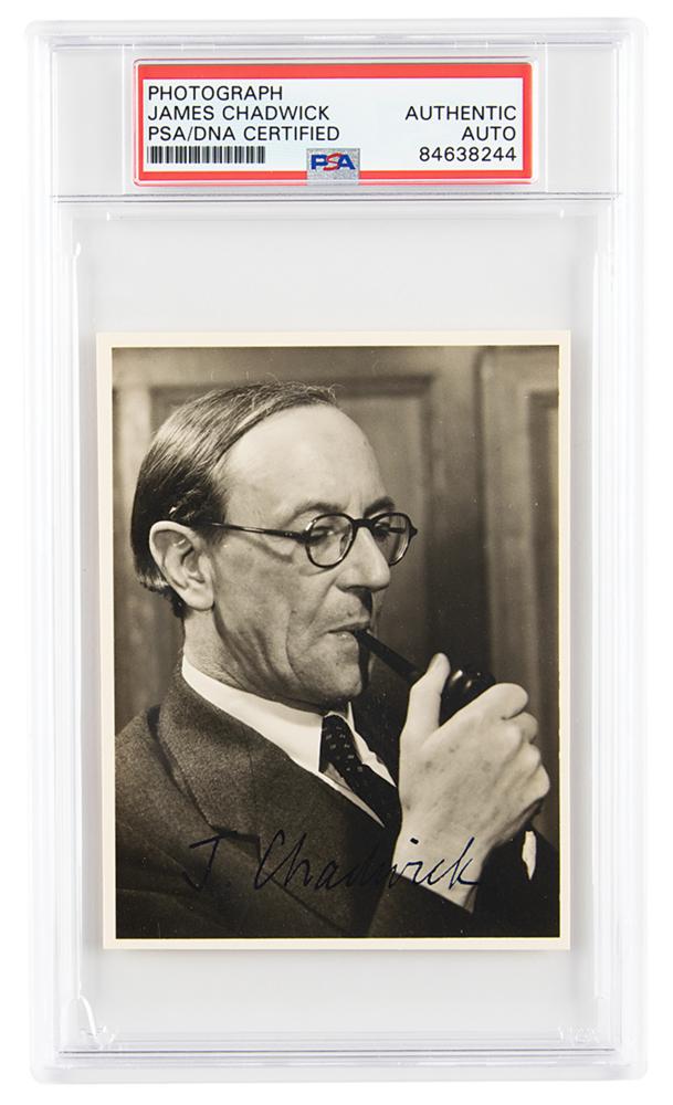 Vintage matte-finish 3.25 x 4.25 photo of Chadwick smoking his pipe, signed in fountain pen, "J. Chadwick." Reverse bears the credit stamp of "A. C. Barrington Brown, Cambridge." In very fine condition. Encapsulated in a PSA/DNA authentication holder.