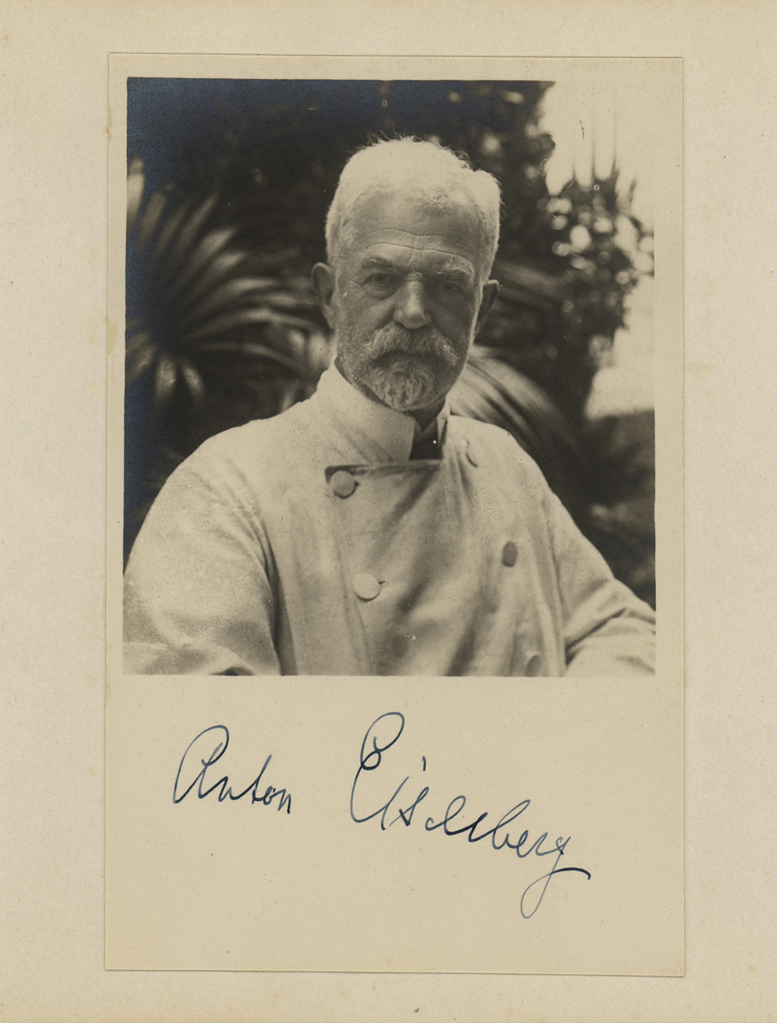 Austrian neurosurgeon, teacher, and clinical researcher (1860-1939) known as one of the foremost physicians of his time; he helped to introduce the model of the emergency room, and is considered to be a 'father of the ER.' Vintage matte-finish 3.25 x 5.25 head-and-shoulders photo of the influential physician, signed in the lower border in fountain pen, "Anton Eiselberg." Affixed to a slightly larger card and in fine condition, with silvering to the dark background of the image.