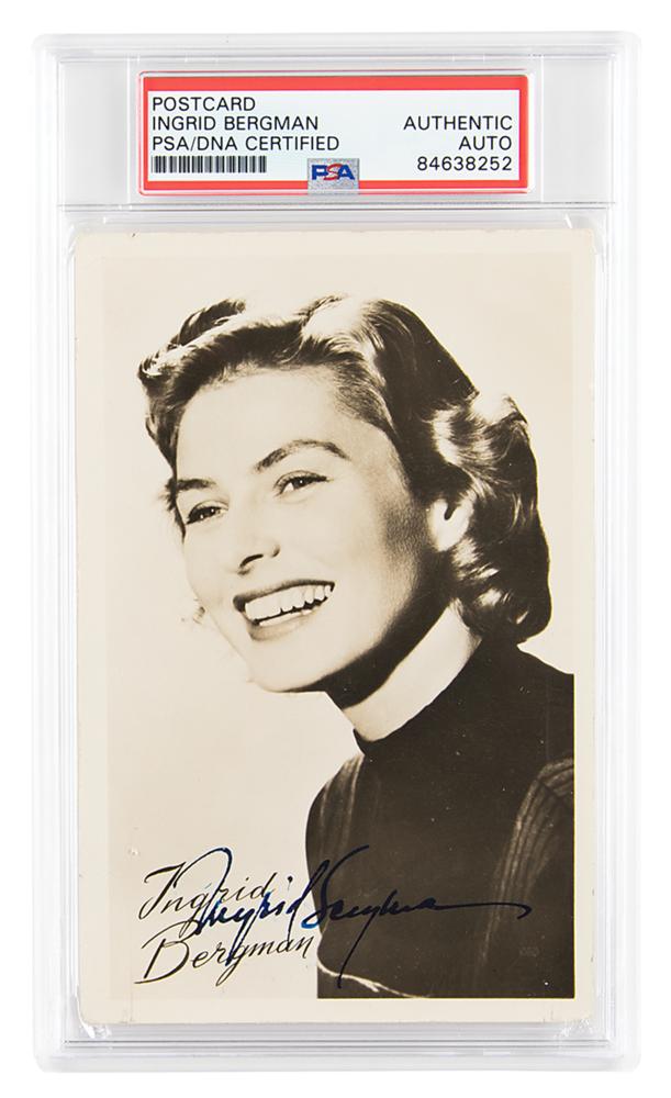 Vintage glossy 3.5 x 5.5 postcard photo of Ingrid Bergman in an attractive head-and-shoulders pose, signed at the bottom in fountain pen. In fine condition. Encapsulated in a PSA/DNA authentication holder.