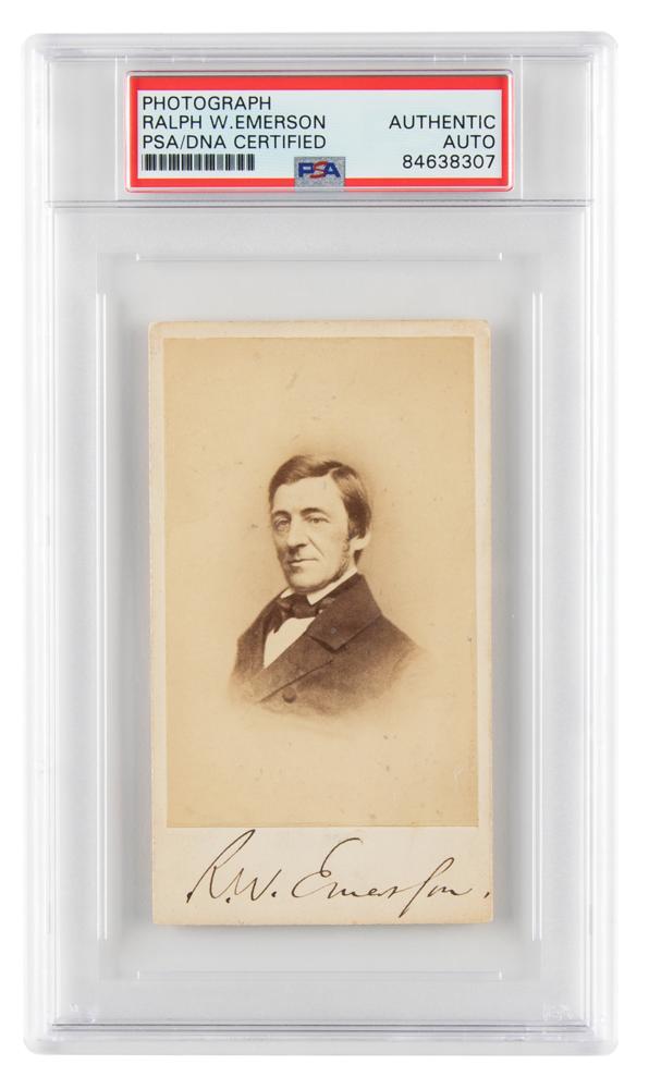 Scarce 2.25 x 4.25 carte-de-visite photo of celebrated transcendentalist Ralph Waldo Emerson in a distinguished head-and-shoulders pose by Silsbee, Case & Co. of Boston, neatly signed on the mount in ink, "R. W. Emerson." In fine condition. Encapsulated in a PSA/DNA authentication holder.