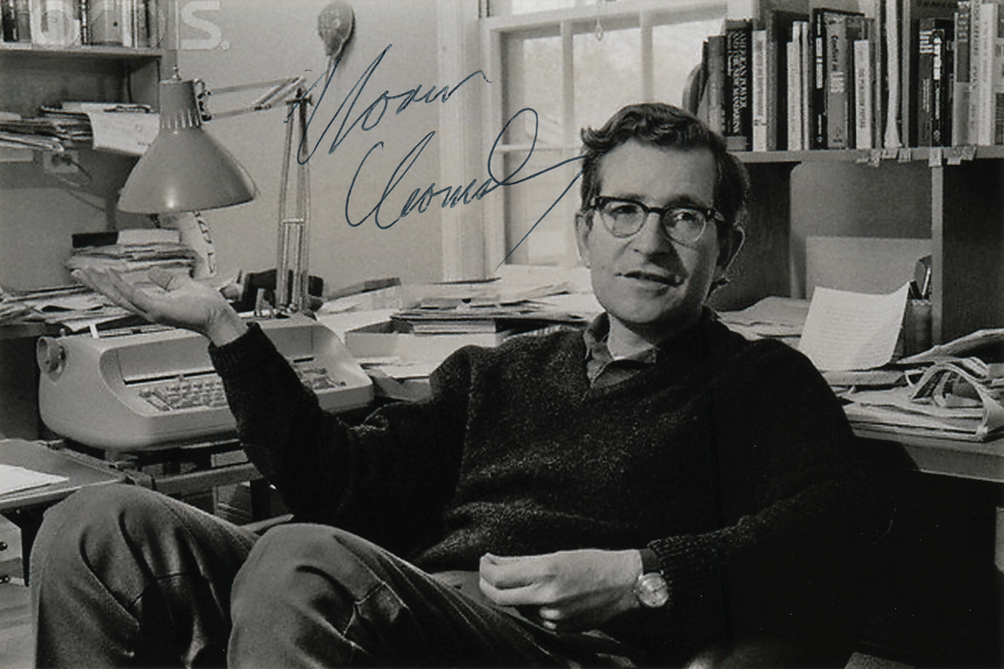 American linguist, philosopher, cognitive scientist, historical essayist, social critic, and political activist (born 1928). Glossy 6 x 4 photo of Noam Chomsky in his office, signed in black ballpoint. In very fine condition.