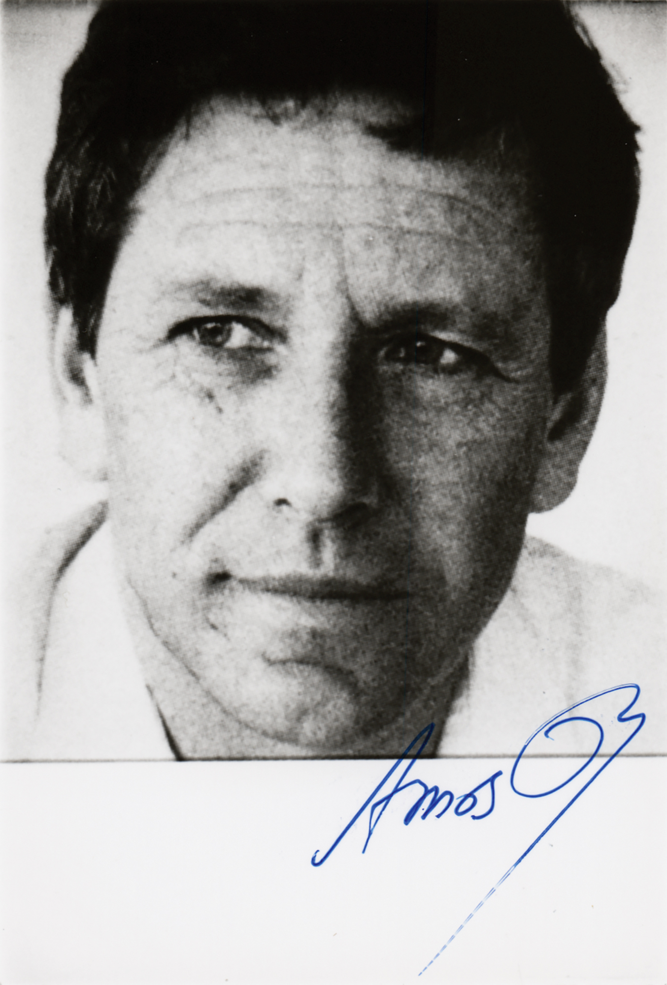 Israeli writer, novelist, journalist, and intellectual (1939-2018) who was a prominent advocate of a two-state solution to the Israeli-Palestinian conflict. Glossy 3 x 4.5 head-and-shoulders photo of the Israeli writer, signed in blue felt tip, "Amos Oz." In fine condition.