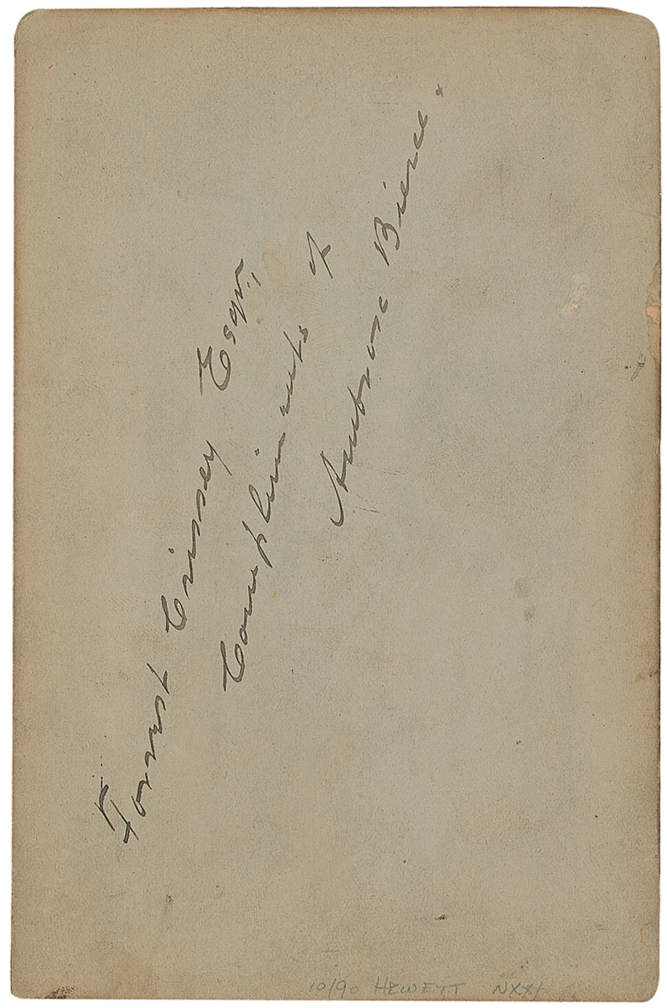 American writer (1842-c.1914) best known for his vivid short stories (including the classic 'An Occurrence at Owl Creek Bridge') and his satirical 'The Devil's Dictionary.' In 1913, while traveling with Pancho Villa's troops during the Mexican Revolution, Bierce disappeared; his ultimate fate remains a mystery. Rare 4 x 6.25 cabinet photo by Blakesly's Elite Studio of California, signed and inscribed on the reverse in black ink, "Forrest Crissey Esqr., Compliments of Ambrose Bierce." In fine condition, with light soiling to the signed side.